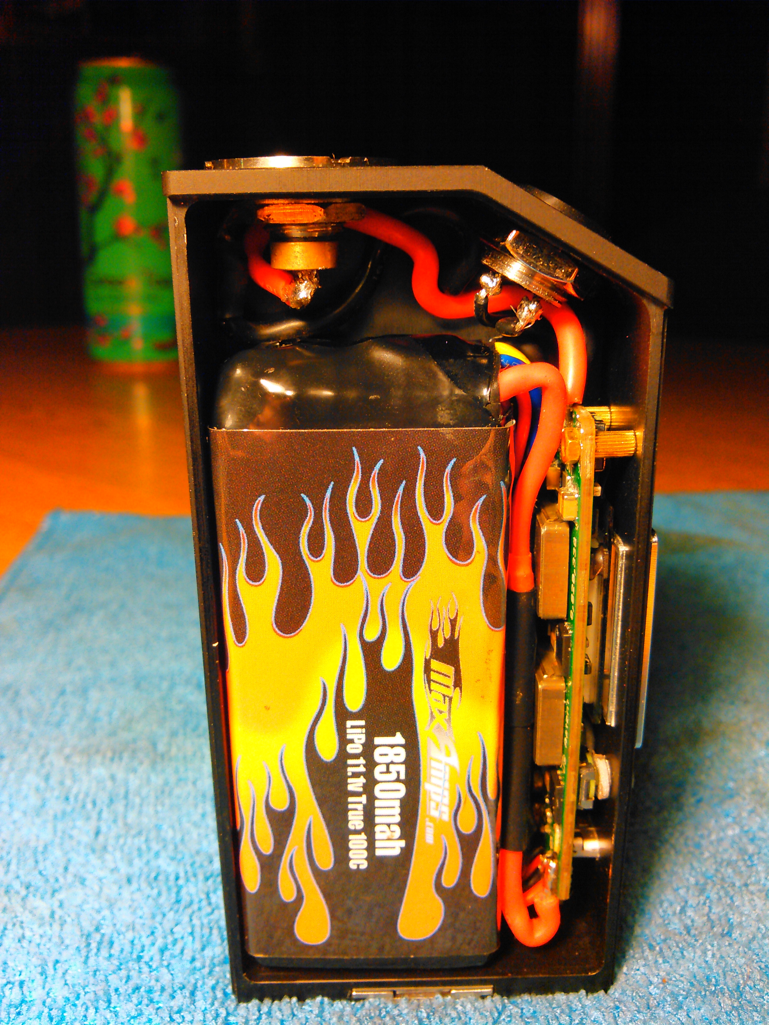 It was James Dean, but when i went to cf wrap and put better up/down buttons, i shorted the chip. I've decided that hard-wiring batteries is a no-no. I'm now using the venom 1300 35c (85*30*19.5mm) in this mod and in my copper 1590g, perfect fit for both and a better battery than those squishy turnigys, wrapped the battery to match the mod and have an extra sliding lid that you can change out.