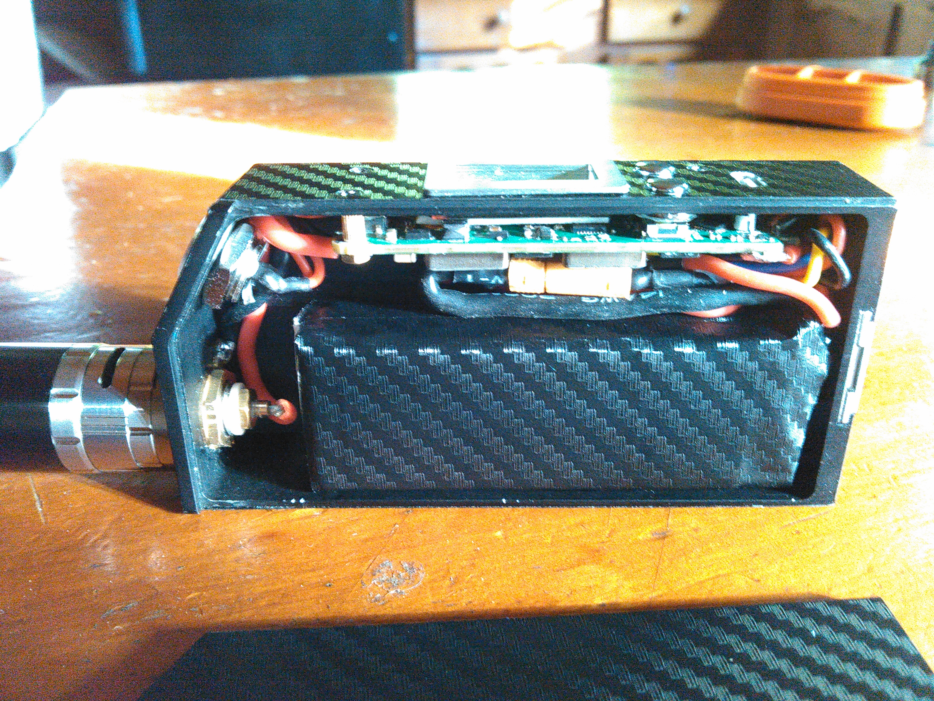 turnigy 1250 (long) in 1590g+ no glue. My first mod. made the lid slide and lock to the bottom of the box, it has a cool switchblade effect to open it. NYKADEMOS.ecigtheme