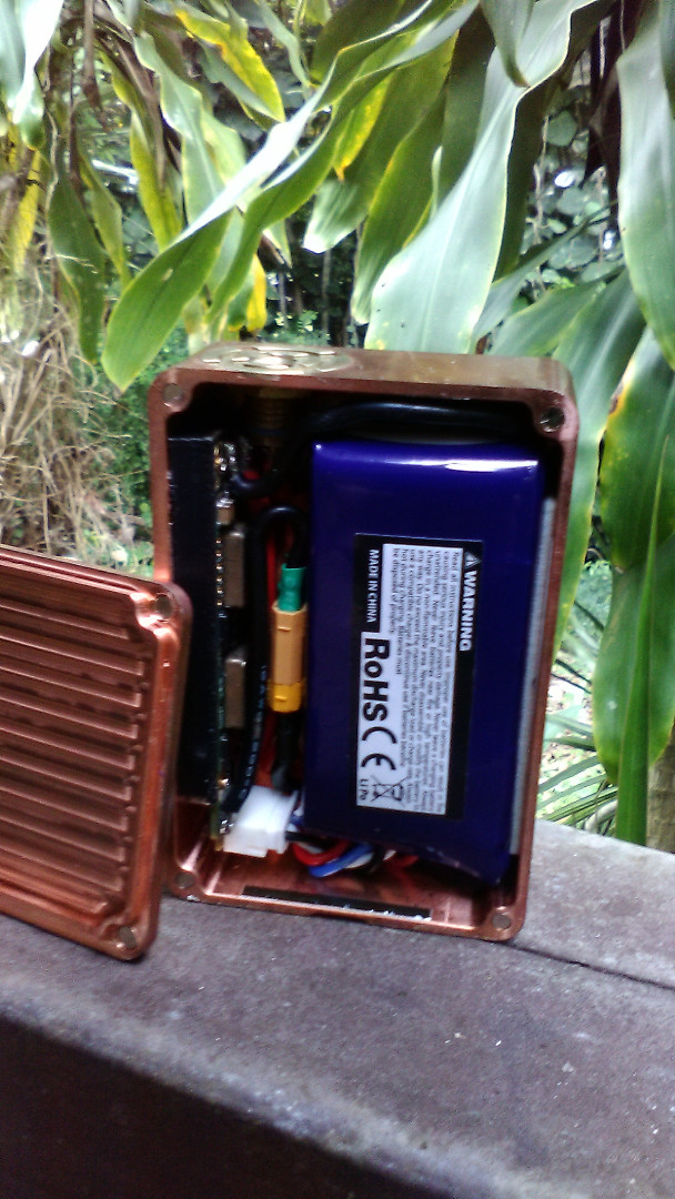 O.K. Here it is. I made some modifications to the box and lid to make everything fit without resizing any wires on the battery itself, the idea is an easily swappable battery, I have two. The guy on ebay that sells the 1590g with a sliding door wont ship to me in Hawaii, so I made the lid slide by removing some lip on the lid, also made notches so it locks on the bottom magnets (actually pretty slick, slide open with my thumb and it magically leaps down and relocks on to the lower magnets keeping the lid in perfect line and hoilding it for me while i show off my guts). I also had to carve out three corners. if you wire the jst plug away from the board this can all fit without any carving, the battery does fit without ant carving of the corners, it actually wedges in, for my intentions of an ez swap battery i chose to do a little dremmel work. this is my first mod, i've never built anything really. I make Hamburgers. That being said I am pretty proud of myself and am thinking if i got a dremmel press and router setup this would be really ez to make to a higher level of craftsmanship looks-wise. I did freehand the usb and window with a dremmel but I kinda dig the flintstone look. I coulda countersunk the chipmount screws a tiny bit deeper but all in all I am fuckin stoked. I could retouch some things on this but I am gonna leave it just the way it is as a reminder of my first mod. Oh, also note the magnet I had to recut for on the top corner, did that so the battery could slip under it. edit...no glue used, no button replacement.... I dissassembled the metal button switches and used the tops as actuators, I had purchased the mamu buttons from shapeways- metal takes like a month, but i lost one gring it but i like these and was happy i could use them WITHOUT REPLACING THE ORIGINAL WATERPROOF SWITCHES/ wich apparentltly the interwebs thinks cant be done for some reason, I used mamus mounting plate for the chipmount and her/his? template to cut out my holes.
