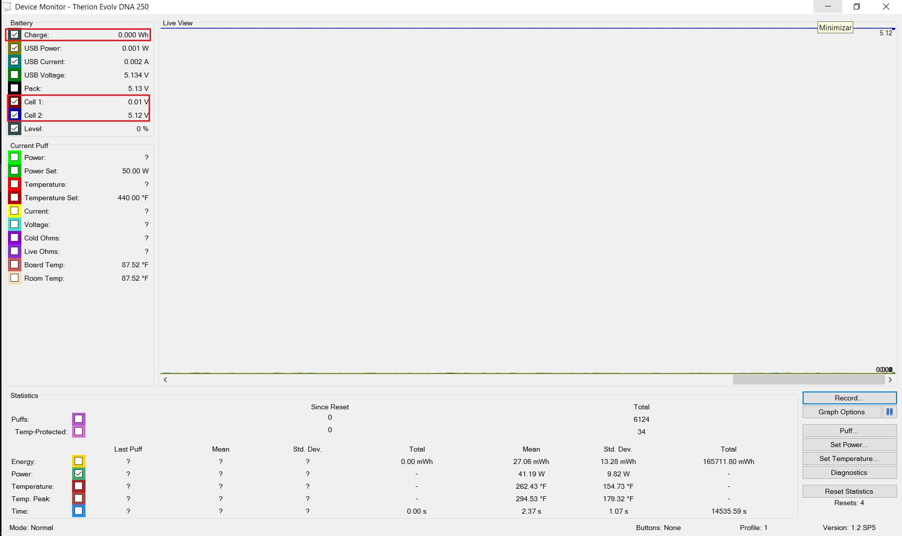 Hello All / Evolv, I will describe the problems found in my new therion 166W DNA 250, Until today it has worked correctly without any problem.. but since yesterday, I'm observing on the screen that the battery indicates to be empty, when turns on the mod the screen shows check battery. Description of the problem (check battery): Investigating the problem... I am observing in the Device Monitor the cell 1 has only (0.01V) voltage constant and the cell 2 marks constant too 5.2V, I have checked the Batteries (2 sony vtc6) are correctly loaded in another mod. I tried to exchange them but without success, I have verified that the batteries are working correctly in other mod, When I disconnect the mod from usb / electrical grid it goes in the off state. Any ideas?, Someone has happened to this same ?, what can I do? Attached screenshots of state.