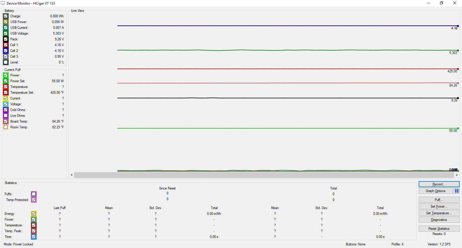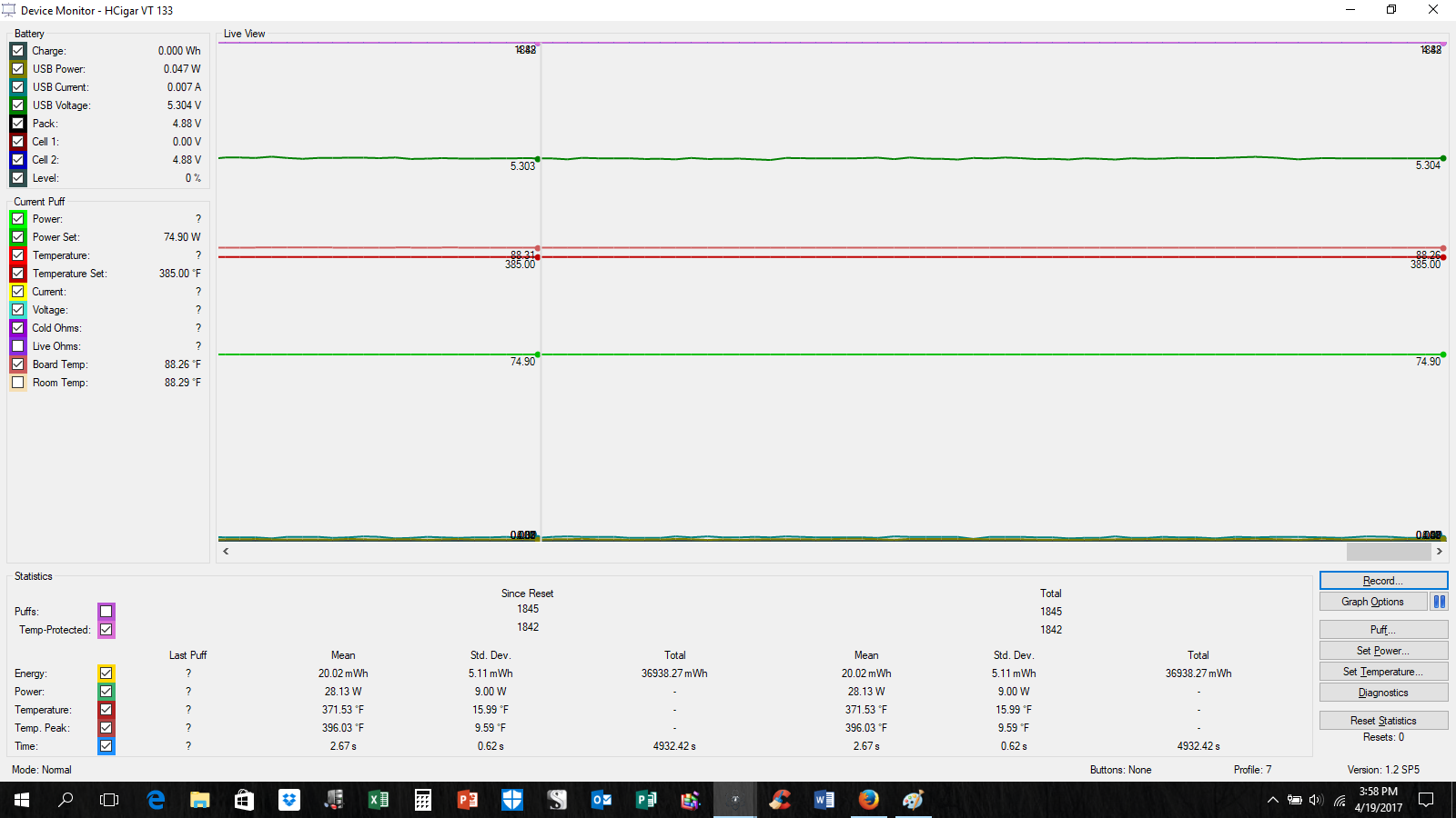 Yes, 5.11 volts, standing. Here's a screen shot with the mod firing. It drops to 4.96 volts, according to device monitor. BTW, at first, the battery charge was reading at 63%. But, it would not charge. After a hard reset, that disappeared. -