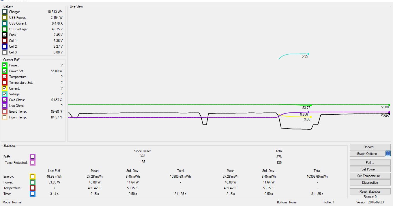 On a non related topic, could you kindly explain to me how the resistance locks in the DNA am I right to understand that it automatically locks unless there is a variance of 25% it then resets it to the new reading. reason I ask is notice the resistance in the charts it spike to 65 ohms and not sure if its normal. I've attached the charts one @ 55w the other @70w. I see it hits the 5.95 limit however shouldn't my batteries be able to withstand the higher needs (2x LG HG2 3000mAh 20A 3.7v). would t be accurate to say as long as I use the 18650s I wont be able to vape with high wattage unless I attached a higher rated ohm coil? or can I tweak the battery settings safely to allow for the higher draw. Another thing I don't get and id probably get shot for this comparison but how come my cuboid 200 allowed this but the DNA doesn't.