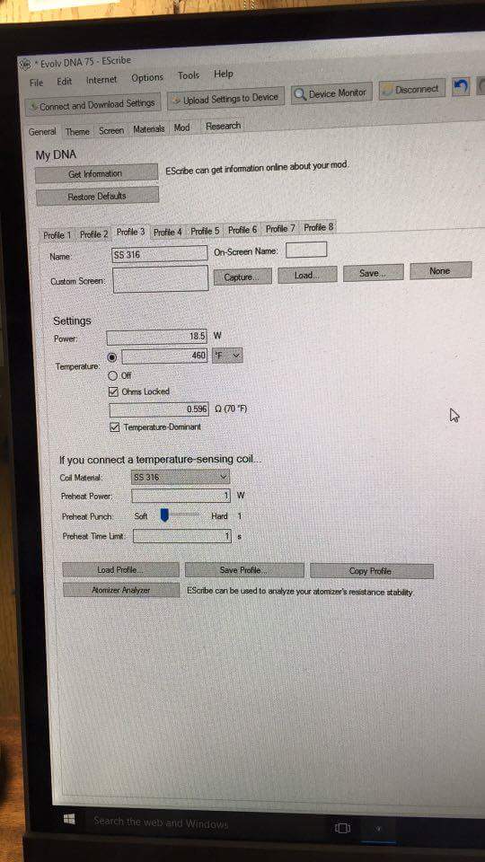 thank you I reinstalled drivers looked at the file I use on that mod and noticed in material watts was no longer on device and temperature control shut off I am using kanthal none temp by having nickel instead of watts selected causes a problem it's been working no problem since using one of my other files the ohms reading of the coil .24 never changed .