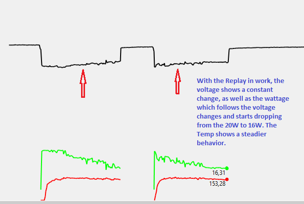 Thank you @dwgraig1 for your answer. Yes, the other two DNA mods and one VTC Primo mini report the same coil resistance (0,841 - 0844, - 0,851) respectively. The same coil (SS316L) I have tried it in wattage mode, with almost same results. Please see the below screenshots. The leftmost is without the Replay. Watt almost steady at 17. The yellow line is the current. The rightmost is with the Replay On. Watt drops down in a fraction of a second and ranges from 14 to 14.7. Believe me, the two watts make the difference in the vaping! -