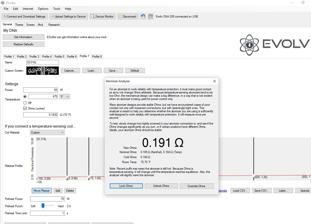 I picked up some Aspire trition 0.15Ohm ni200 coils for my driving tank, Project sub-ohm saucecode. First I'll say the pack I got are labeled 0.15Ohm, but I've checked 2 of the 5 and both read 0.22Ohms on an ohm meter and on my Efusion. Just working the first one in and it will actually drop ohms and ask new coil every time I adjust settings in Escribe. ex:0.22Ohm coil will drop to 0.20ohm after I upload settings and fire the first time asking new coil. To add to my confusion now after vaping and letting the tank sit for an hour or so now the ohms read 0.34. Vape on it, take the tank off and put it back on and get prompted new coil and ohms drop to 0.27, Anyone know whats going on? Should I lock the Ohms for an ni200 coil when its first used? Kind of confused on this as I've read to not lock a dna200 for it to be accurate. Really appreciate any input to this issue. Edit: To add to the confusion the coil keeps dropping out of temp control between vapes and will only go back into temp control if I lock the Ohm's.