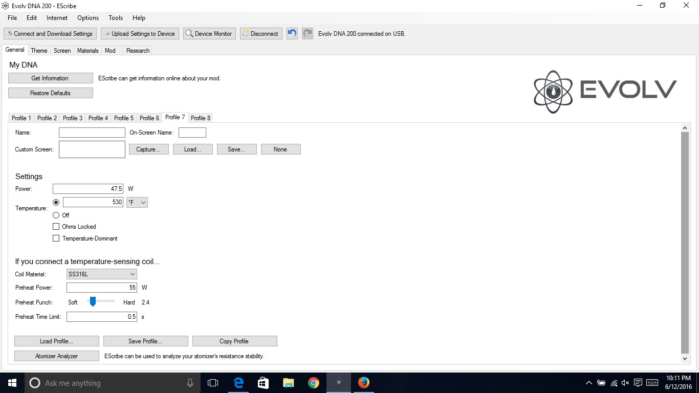 I got the Efusion on wed the 9th. updated the firmware and loaded the Efusion profile on it. I've been using ss 316l on a Kennedy with out issues exclusively so far. I changed the battery to 14.43WH and it charges to 100%. I have a dual coil 24g 316l, 3.0mm, 7 wraps each. comes out to 0.167 ohms according to escribe, and when I lock the resistance it locks at 0.17Ohm. Temp is set to 450°, Wattage is set to 47.5w, 75w pre heat, with punch set to 5. So far I'm really enjoying it. My only complaint is battery life. I'm a heavy vaper and go through about 20ml of juice a day so I charge off and on through the day. Hope this info helps some of you with the ss temp issues. -