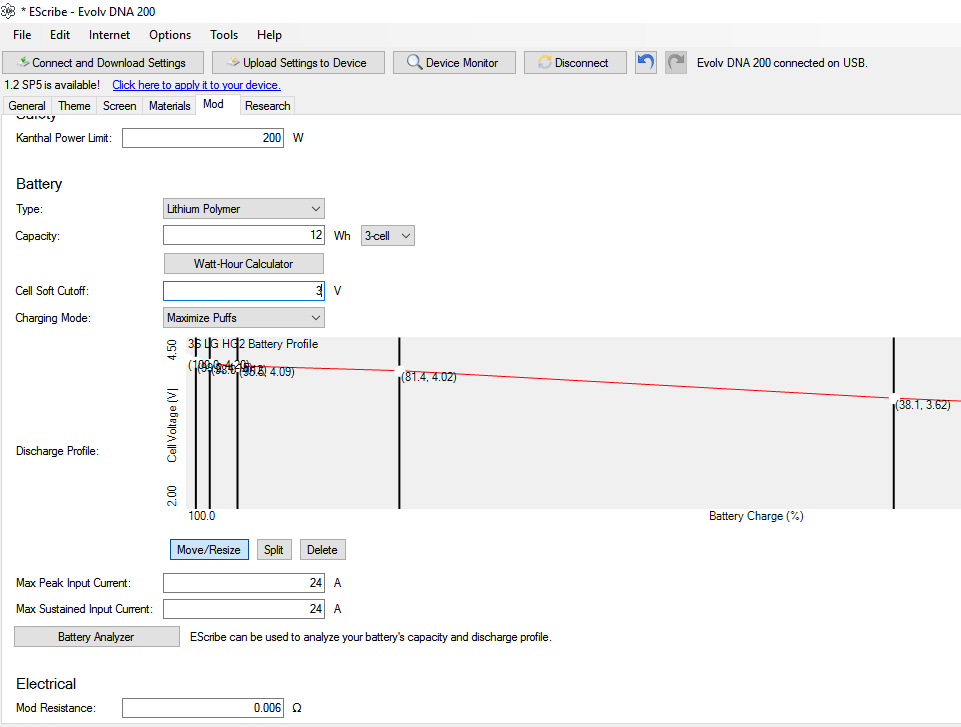 I bought the "Player Box Mod DNA133/DNA200 by Starss" and the also the optional "Player Mod 1100mah LiPo Battery by Starss" Does anyone know what Settings to set in escribe once you install the 1100mah lipo battery? I cant seem to find the settings anywhere for doing this.. It comes default with a tray that uses 2 18650 batteries and they sell the optional 1100mah lipo battery pack for $20 that takes it from 133w to 200W if anyone could help with all the settings i need to change in Escribe that would be awesome! Thanks!