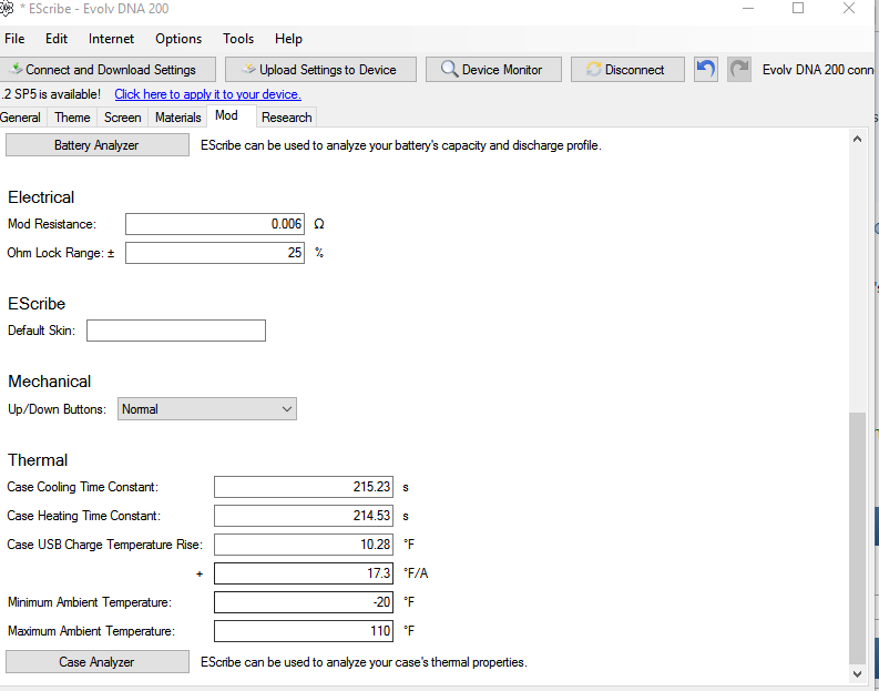 I bought the "Player Box Mod DNA133/DNA200 by Starss" and the also the optional "Player Mod 1100mah LiPo Battery by Starss" Does anyone know what Settings to set in escribe once you install the 1100mah lipo battery? I cant seem to find the settings anywhere for doing this.. It comes default with a tray that uses 2 18650 batteries and they sell the optional 1100mah lipo battery pack for $20 that takes it from 133w to 200W if anyone could help with all the settings i need to change in Escribe that would be awesome! Thanks!
