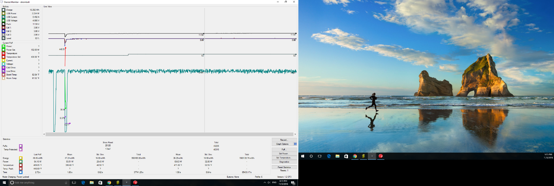bit of an odd one here ,i know this is an old chip DNA 200 40k+ puffs but this week it has stopped charging. on the device monitor it shows .5 amp (computer) but what ever level the batttery is initially it balances the cells and then stays at that level. here are 10minutes of the device monitor, and you can see after the puff it balances to 3.86 per cell then stays at that level. i can come back in an hour and it will be the same. it is a 2200 mah 3s lipo, and the lipo charges fine on a lipo charger. what happens when you plug the mod into a wall wart? i can see that USB current is being drawn from the computer, it has to be going somewhere. if you leave it sit for a few hours on wall wart the pack voltage will not go past 3.86v? does the mod get very warm or hot during the charge cycle? are you positive you have a solid main +/- battery connection to the board? if you have a DMM you can see if the pack voltage rises when you plug a 1a USB wall wart into mod. with a 1 amp charger, the pack voltage should rise a tiny bit as soon as you plug the USB in. last course of action is to contact the vendor you purchased the mod from or contact Evolv directly, through a help ticket. https://helpdesk.evolvapor.com/index.php?a=add -