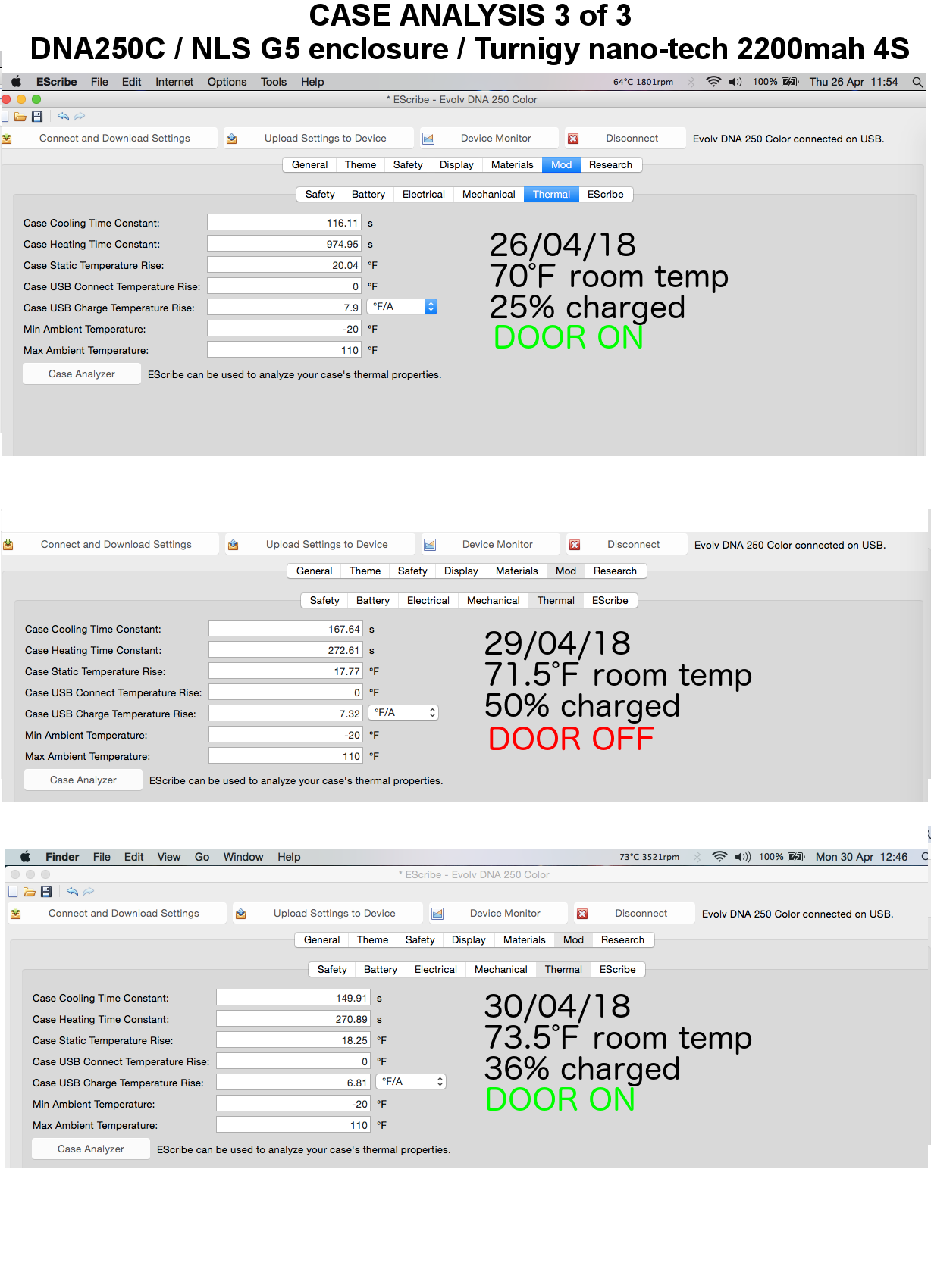 16. Case thermals run again no door 50% charge 71.5℉ Turnigy nano-tech 2200mah 4S 25~50C Lipo Pack Spec. Capacity:2200mAh Voltage: 4S1P / 4 Cell / 14.8V Discharge: 25C Constant / 50C Burst Weight: 218g (including wire, plug & case) Dimensions: 100x35x30mm