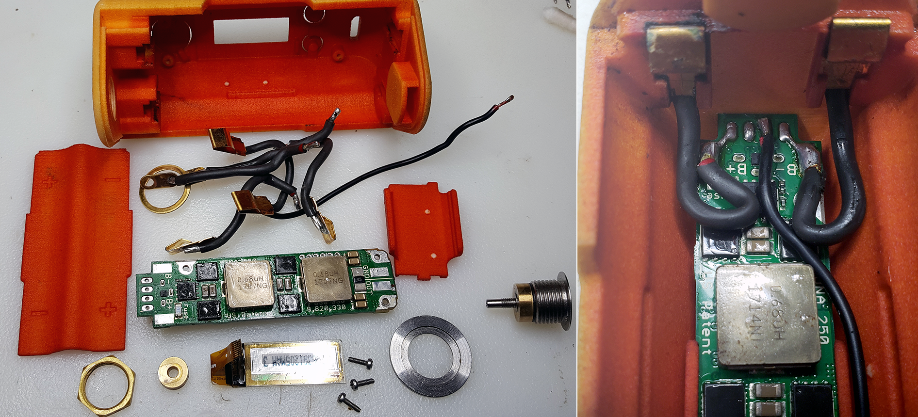 Another dual battery DNA250C squonker from China, called VapeCige VTX200. This one started leaking like a sieve after one week. Because they used very primitive 510 connector. In this one, I had to use an Italian silver plated connector ModDog, I just had to machine it to fit and drill two holes. I also made a stainless steel offset elbow.
