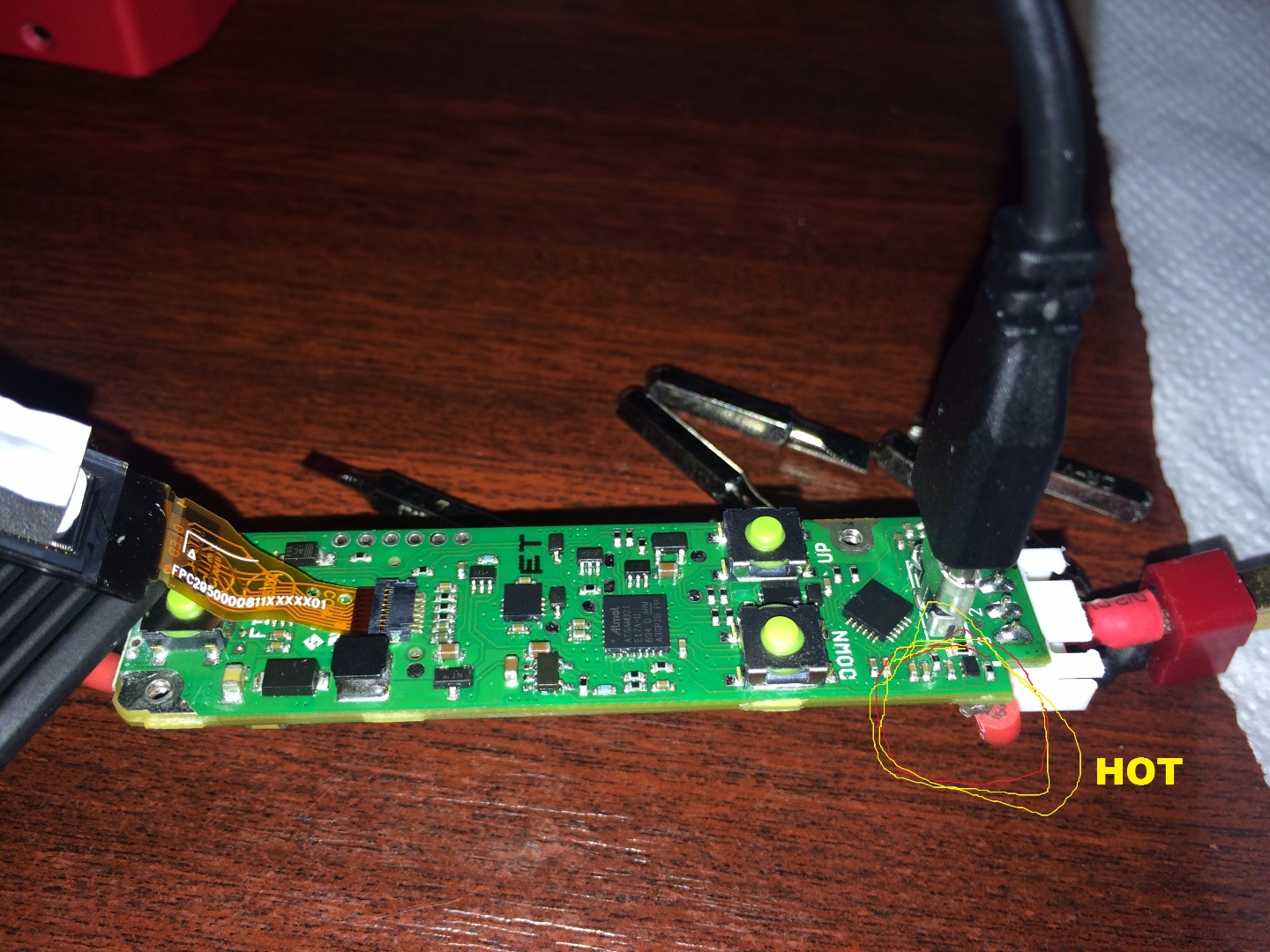 I tried with 2cell Lipo... nothing... it shows 0.93 A from laptop USB ...and the 3 battery voltage does not increased .... I figured that near USB on the board is a very hot small area .... only on one side... Lipo was disconected...you have some photos with that area on my board. 1. Do you think that an electrician can repair this board? 2. Can i change this board with another dna200 from a Hcigar Vt133 where i`m charging batteries on an external charger and put there this dna200 wich fails to charge Lipo ?