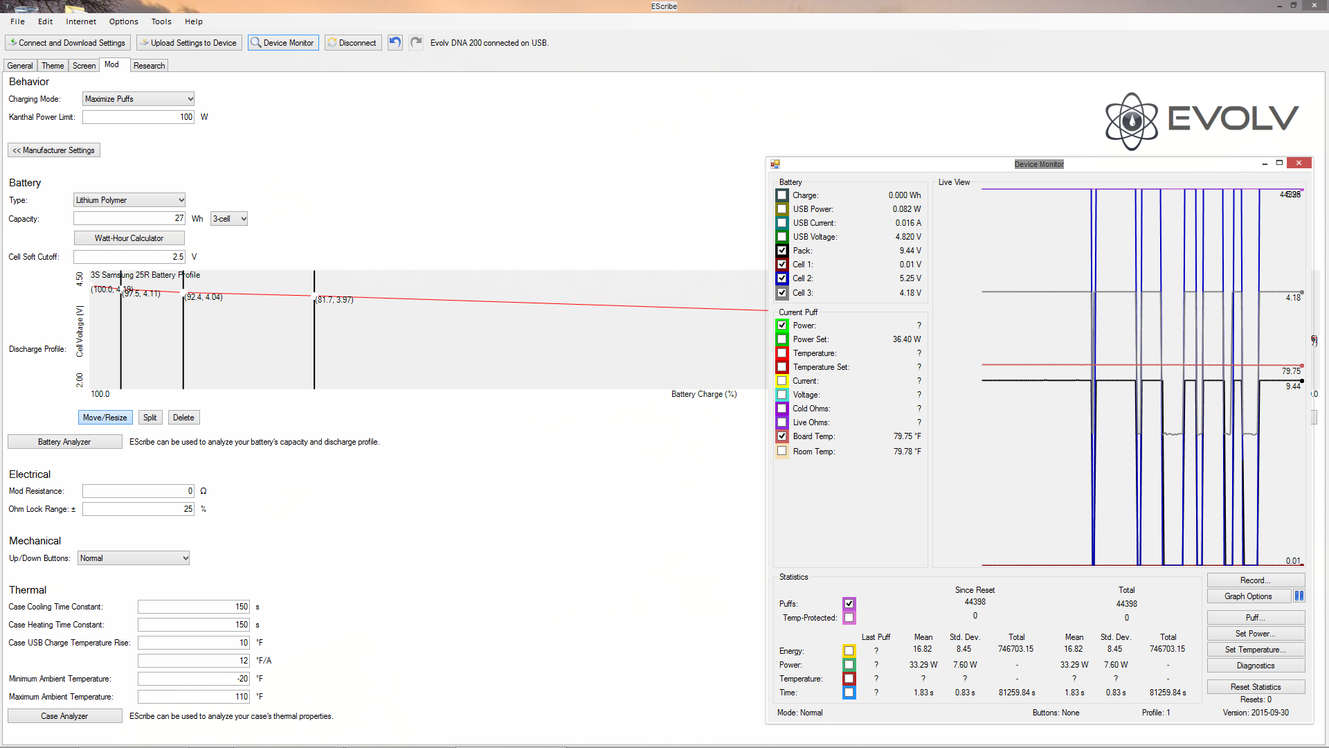 I would like that, however I don't see any other option at this point. Absolutely, I've sat for literally hours rotating each set with no results in the device monitor. I've tried Vtc4's - Vtc5's, Samsung 25R's and the LG HG2's (chocolates). All boxes are ticked for real time readings and the voltage is steady unless I'm rotating cell 2 which reads either 5.25v.. or 0v. Just to give you an idea of the problem.. when I fire it up the evolve dna screen flickers for about a second and then goes to black... and yeah, it's just been a bootloop of that over and over unless it's plugged in via usb. I've tried to upgrade/downgrade firmware, hard/soft reboot, upgrade/downgrade escribe.. nothing seems to work. I've also tried to tighten down the ground screw in cell 1 with no luck. I'm not sure if I should go any further and open it up, I don't want to do anything that would void the warranty. (Just to clarify, I've tested each set of batteries with my multi-meter and they are all perfectly balanced) By the way, thank you for getting back to me quickly, I do appreciate it. Any other ideas on what I should do from here?