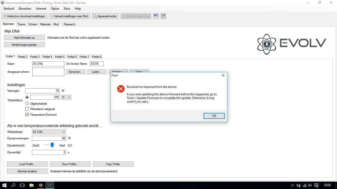 Hi, After having upgraded Escribe to v1.2 (on DNA200.de, the German Crew website) I was able to upgrade the firmware both of my HCigar VT133 (DNA200) and HCigar VT75 (DNA75). However, since then Escribe does not connect to either of them anymore, and it cannot retrieve the serial numbers of the DNA boards. See the screenshot attached. Therefore, I cannot use Escribe anymore to change any settings of either mod. How can I restore the previous firmware? I tried to load a previous sw-update file, but that triggered another error message, the details of which I have attached in a docx-file. I hope someone can tell me how to revert to previous firmware! Thanks for your answers! Error_message_Escribe.docx