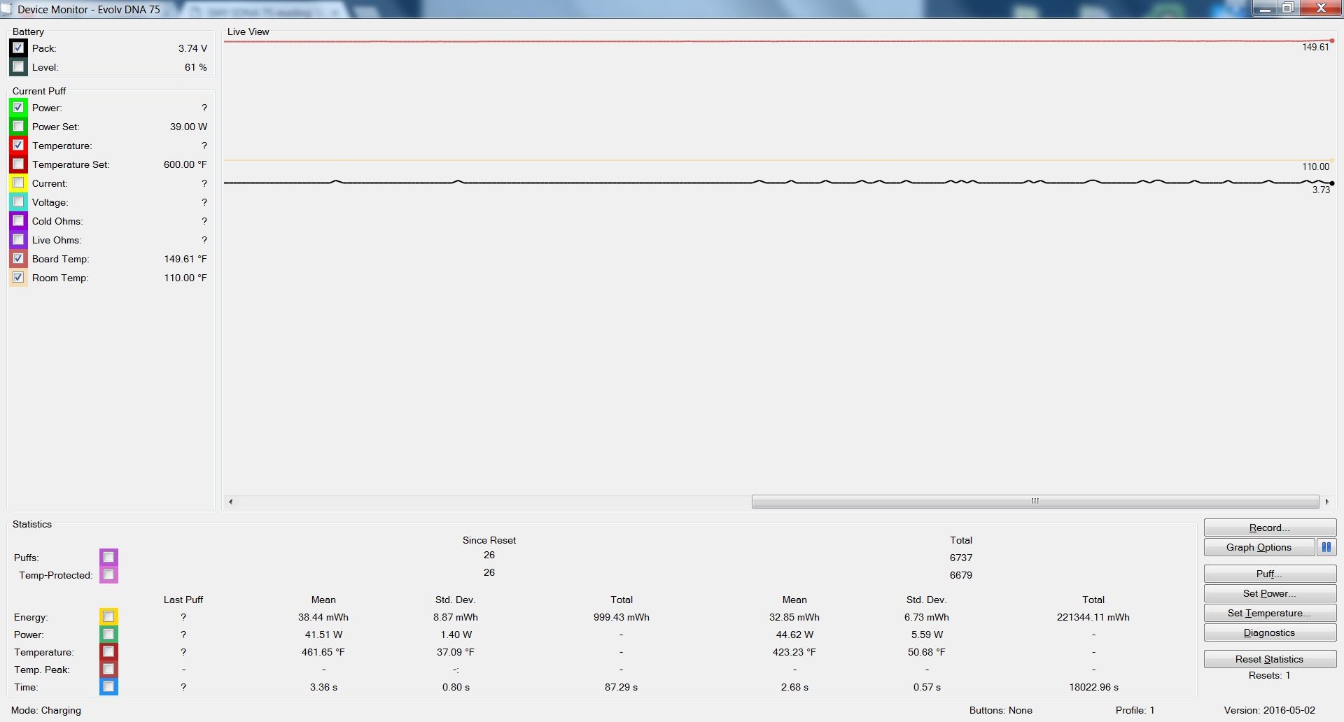 EDIT: fix found and posted in #6 below. I have several DNA75 and 200 mods and have never seen this before. I have about 8 Freemax tanks tanks that I use in rotation all using the same .15 NI200 coils running between 38-45 watts on all my mods. The other day, after a few pulls, the mod read 'too hot'. The board shouldn't even have been much higher than ambient at that point. So, I plugged into escribe and the board was reading over 180F and room temp displayed 110F. It was about 68F outside. I tried soft reboot, nothing. Hard reboot, nothing. I was only successful in removing the error by updating the firmware (same version). I then went to use it, and again, after 5-6 pulls, it read TOO HOT. this has happened 4 times in a row now. I am not fully in-tune with escribe and its far reaching capabilities, as Iv'e only used it for basic programming changes. Does anyone have any knowledge of this, and a fix? Or, based on this just continuing to occur, is the board faulty? thanks,