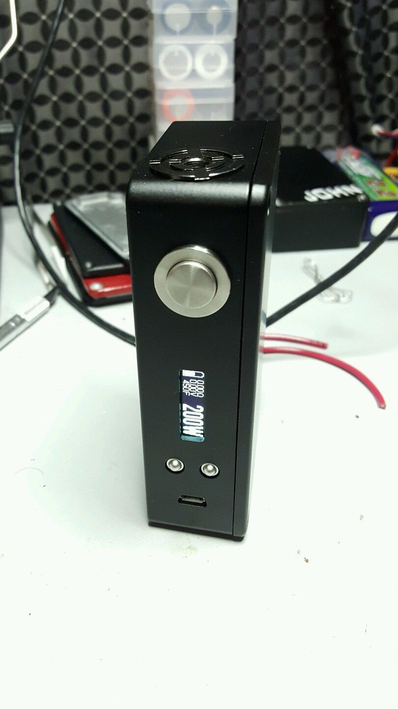 DNA 200 in a Flat Black 20% Matt with 2200mAh LiPo with XT disconnects and extended Zip charging port. Finished off with a 510 v4 fatdaddy and a 16mm Orange Halo button. -XEVape