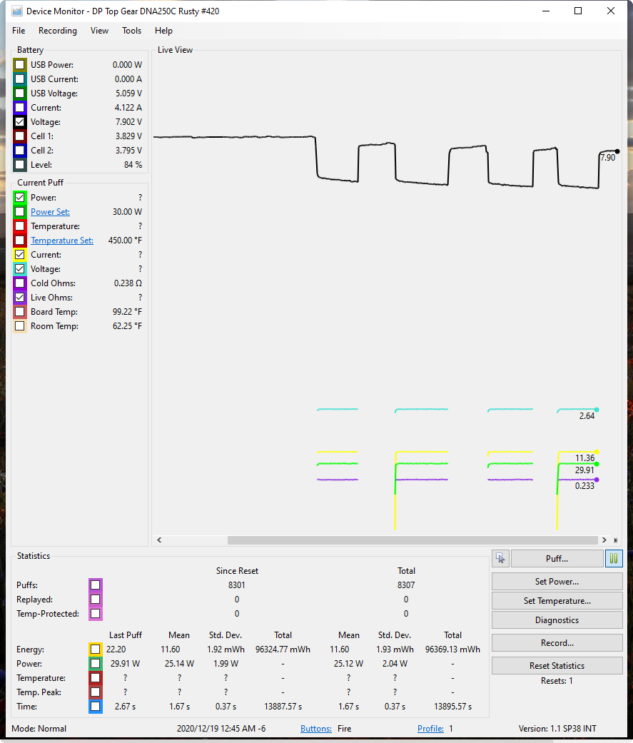 That sounds about right for lower temps for fruit flavors. And it sounds like when you use wattage mode, you are vaping at higher than 420°F. Maybe that is why you like the flavor better? By the way, Replay under wattage mode will also give you dry hit protection. So no worries there. The CSV files from steam-engine are calibrated curves based on the material. If you change them it will no longer be calibrated. You could create a calibrated one yourself with the right equipment. As for willy-nilly changing one, I don't know why you would. It most likely wouldn't vape right. As for the puff counter. Well there are a number of puff counters in the DNA. There is a resettable one, a non-resettable, a TC one, and maybe more. And the one in the graph never seems to match any of them (it is always a bit higher). I am not sure why that is. Someone might know. I do have one DNA250C that I never fired and I bought it as a spare and EScribe says it has 0 puffs on it. I never seen one with 0 puffs before, as they always come with a few on them. I should check to see what the graph says, eh?