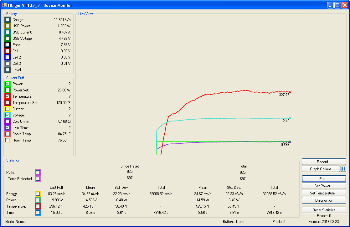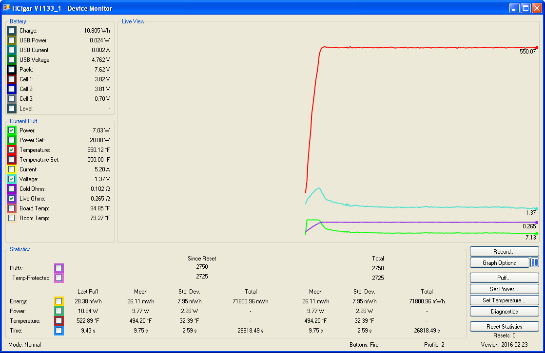 @ChunkyButt200: I really appreciate your reply. Yes I have heard others speak about the RBA not reaching down far enough to make a good connection. So solder sticks to SS? Yes this could be the whole problem for sure. Although I would also expect to see this in the resistance. I do have an odd resistance thing going on that I had seen with the old build too. That is overnight it was sitting for 9 hours and the VT133_3 should see it as 0.11 ohm. But it saw it as 0.17 ohm. And it didn't pulse this time. But the wattage stayed pegged, the volts was higher than it should, and the temperature was struggling to get to 470ºF, which it never got to. Here is the screen shot. It acts like some of the power was going somewhere else, besides the coil. But the resistance is showing it is just higher than normal. But not that bad to explain the voltage, power, and low temperature readings. Oh John said cell 3 should read something with two cells? That is odd since all of the wiring diagrams I have seen shows the balance connection pins 2 and 3 are shorted (only TV133_1 shows some voltage while my others show nil). And that is where cell 3 voltage is read from. @VapingBad: I really appreciate your reply. Yes that is a 0.11 ohm Ni200 coil in the first two. But I was moving it from mod to mod and yes it was warm. Only VT133_1 and VT133_3 did it act up on. Everything else I tried the Black Crown ran flawlessly. As I mentioned to CB above, after sitting all night, my VT133_3 read it as 0.17 ohm which it should be 0.11. It didn't pulse this time, but the voltage went to 2.4v and the wattage pegged and even at those settings and even at 0.17 ohms cold, it should have easily reached 470ºF. I am currently running that same coil (Black Crown) on my VT133_2 which I had never seen it act up at all (or my other mods). Oh I am not seeing it hit the voltage limit at anytime. From all of these shots, 2.4v is the highest it has gone. But when I see it again, I'll record the data and see what it says. @black lace: I really appreciate your reply. Although it is acting very much like sudden resistance increases. Although the Device Monitor shows it very stable. Maybe the sampling rate is just too slow to show it. I have four scopes here. Although to use them I would have to disassemble a mod or atty to get to the connections. Either that or build a 510 breaker box which I have been thinking of for sometime now. And yes, I am using a 0.4mm plastic washer. Tried it without too. @All: I have been running this Crown on my VT133_2 which it never acted up on. I just watching it carefully just to make sure it isn't going to mess up on this one.