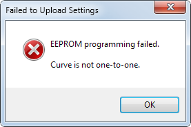 I've Googled (the verb   everything I can think of in search for a remedy to the problem, and only find (end up here) this thread. So another user with the error Failed To Upload Settings / Curve is not one-to-one. Initially was running an older version (1.0.30.1) upgraded to latest 1.0.35.2 --> same-same. Strange, everything works; downloading from device, upgrading device firmware (Reuleaux DNA 200), I can even lock ohms when I select the chk-box for 'Ohms-Locked'??? All the tools seems to work fine reading all the parameters ... Tried uninstall / re-install. Tried the 'compatibility to Windows 7' thin to no avail; run as Admin ... nope. New USB cable ... As soon as I connect (the working device) and hit the 'Upload Settings to Device' button, I get the error (no changes in any of the settings)? From the device itself I am able to make changes to all the settings available (so I'm kinda 'assumin' the device is OK). Anyone find the source of the issue and a fix? I'm kinda at a loss; Any Ideas !?! Failed To Upload SettingsCurve is not one-to-one.