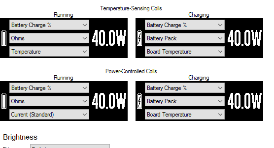 2. Hi Thanks for your reply. I have to select the same display information in both to get that info on device. If I have different items for power and temp modes the device randomly selects one of the two options to display. 1st pic shows 3rd info line as temp in temp mode and current in power mode when I upload to device most of the time it shows current in both power and temp modes but sometimes it will show temp in both modes. The only way to guarantee that the info on device is the same as set is to make both power and temp screens the same second pic. Thought USB current may be only on 200, do you know if there is an options comparison list available to show differences between 200 and 75. Thanks for your help Cheers Si