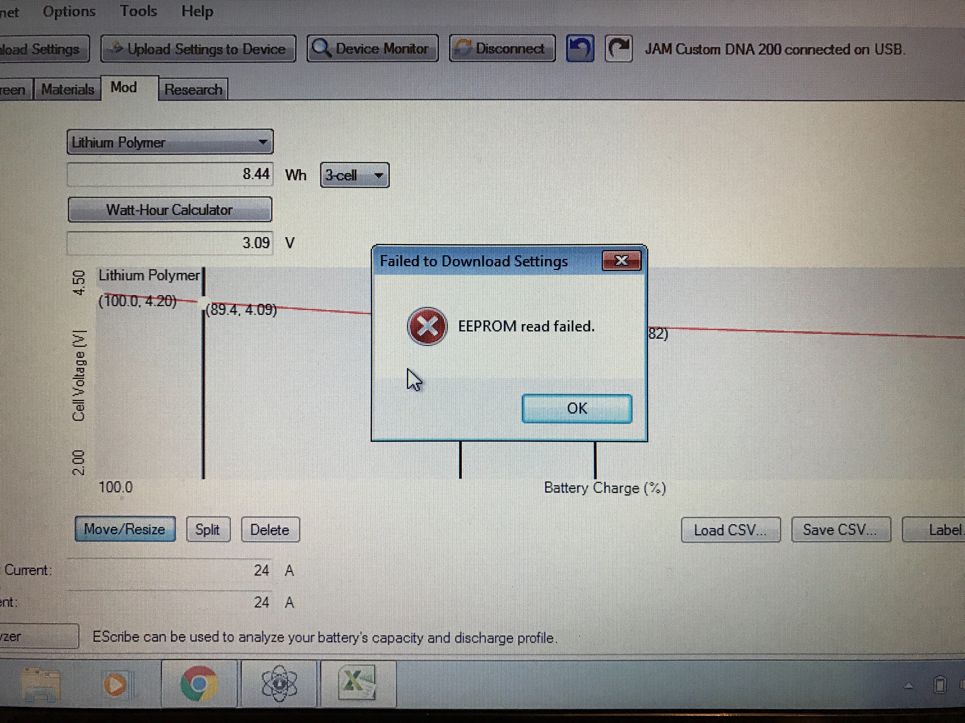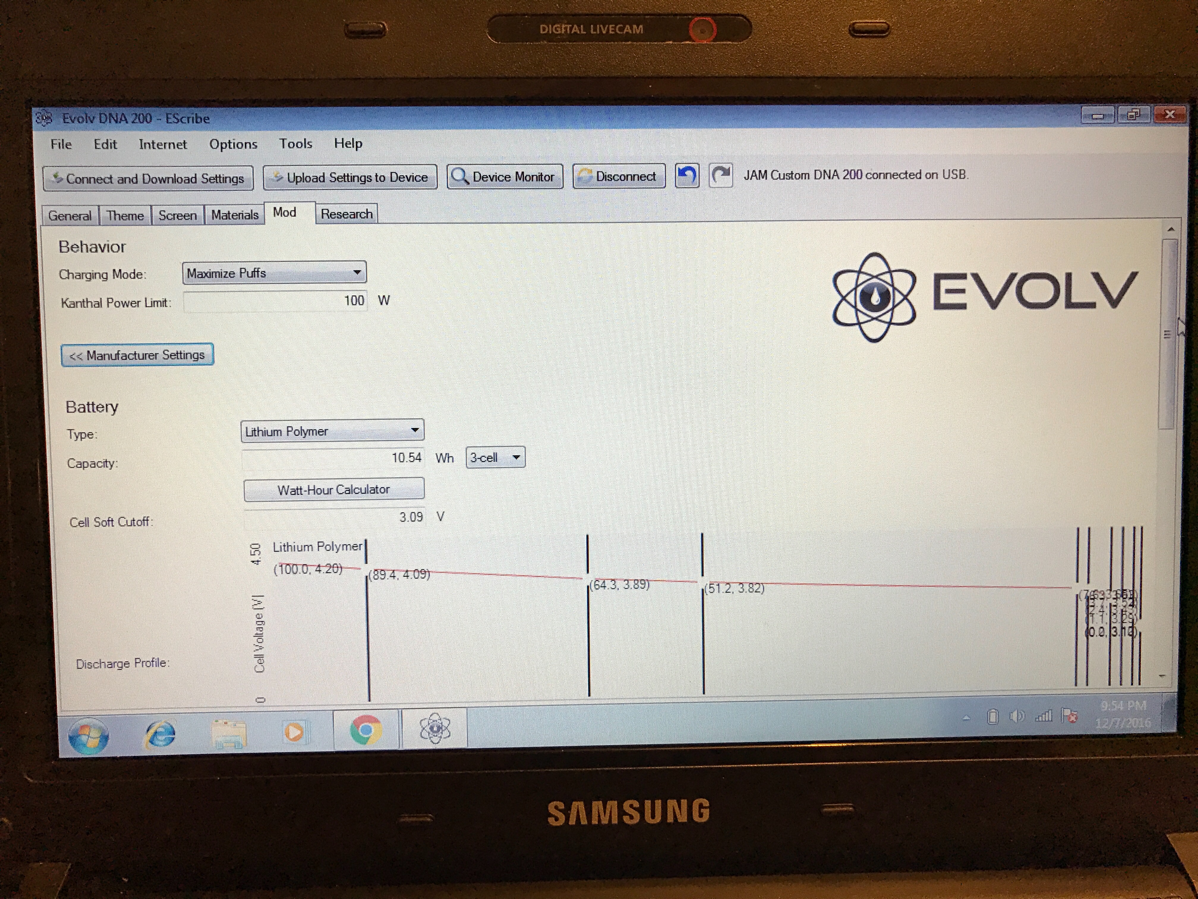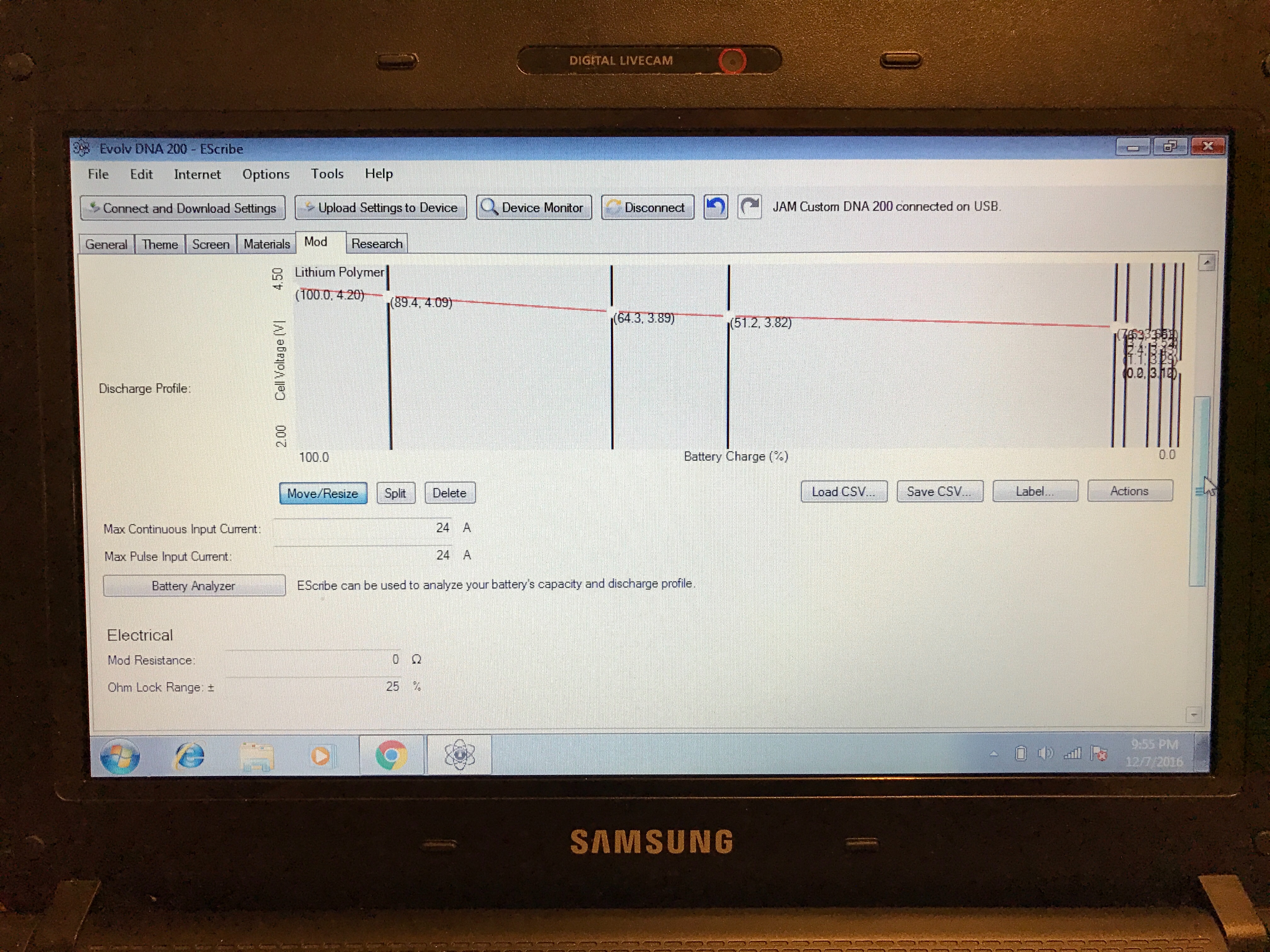 Got a question for the DNA gurus lurking around here. I have a homemade DNA200 mod with a 950 mAh lipo. Once my battery hits 19/20% life it will no longer fire up to the watts I have the device set at (currently 95w). Then, it would seem after letting it sit for an hour or so, once I power it back on the battery life reads at 0%. Everything else works wonderfully, it's just this issue when the battery gets low. I'm not sure if perhaps it's a safety setting in Escribe to keep the battery from getting too low but I'd like to have some idea of what's going on. Thanks!