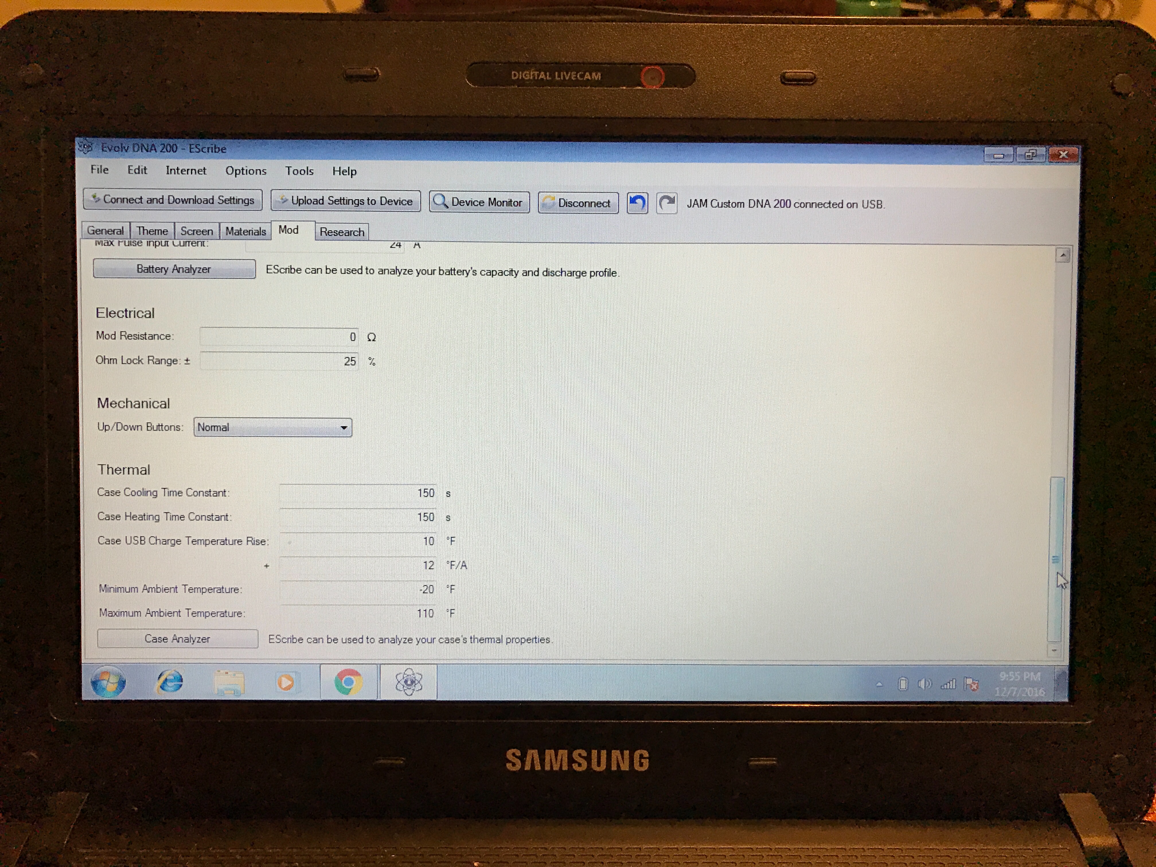 Thanks for the help, here are a few pictures from the Mod tab (sorry for the multiple pictures, I use a Mac normally so I use a crappy netbook for my Escribe lol). The only thing I changed when I hooked it up besides themes was the what hour calculator, I changed it from 1300mAh to 950mAh.