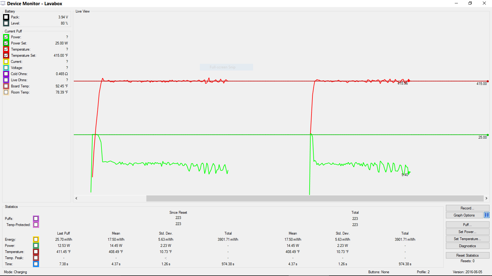 11. Another thing I have noticed is I have a Therion and a Lavabox DNA75. I only use SS316L and I use the .csv file from SE on both. I have exactly the same settings on both which is 25w 420F. I only use a single coil so I use no preheat since it heats up immediately without it but the Lavabox will hold whatever temp I set it at without ever hitting Temp Protect but the Therion hits Temp Protect every couple of seconds which makes no sense to me. Why would it do that using the exact same settings and using v1.2SP3 on both. Am I missing something when I run Device Monitor they are both holding temp relatively stable. I am kind of new to the DNA but I love them coming from YiHi. For SS they seem way better to me. Oh I should add that my Triade DNA200 does just like the Therion with the same settings. Only the Lavabox doesn't hit Temp Protect. I know it's not a bad thing for it to do that but I'm just curious.