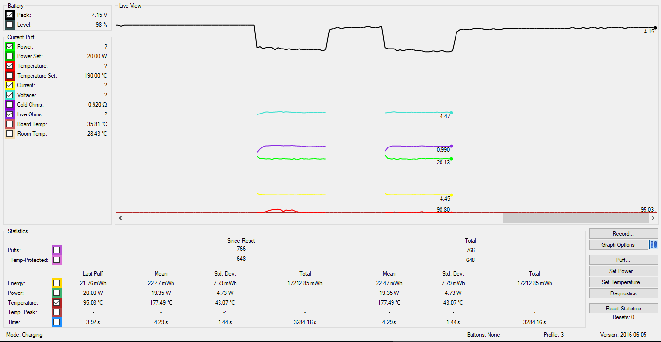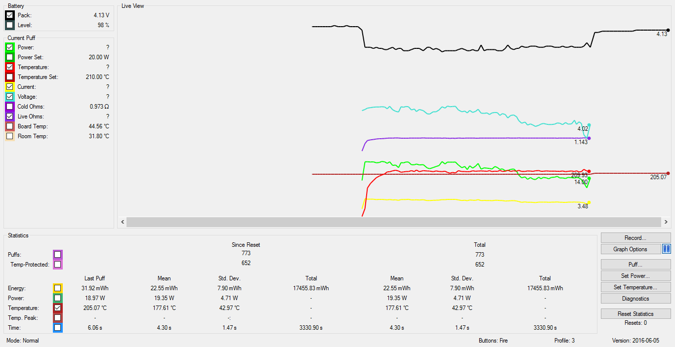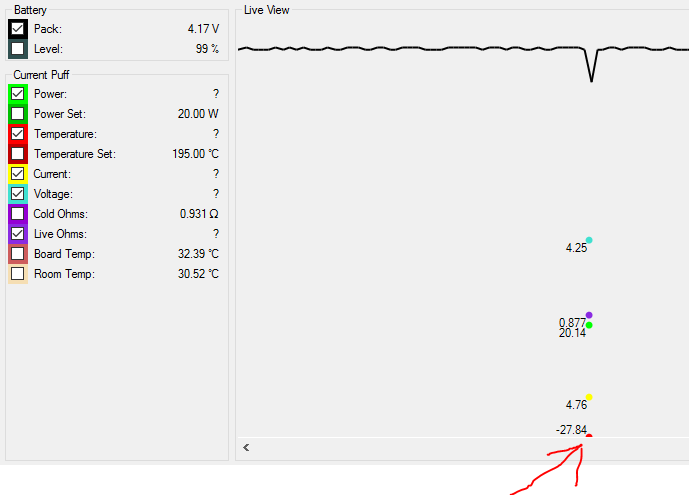 Hi all, As I mentioned in the title, I have a serious problem with the tc feature of a ThinkVape Box 75 device. The mod was first used 4 days ago, and was working fine for 2 days. Then after a battery change and an atomizer fill the temp was way off. Altough it was set for 210 Celsius, and was working like a charm in the first two days, now the temp did not go even close to the set value. After a lot of troubleshooting trys we discovered that although the mod measures and work accurately, the "temp sensing" looks like to start form the ambient minimum. Ohm measurement, volts and watts are accurate, the mod works flawlesly in vw mod, but because of this wrong tc, it is useless as a tc mod. I tryed everything I can think of, threads were cleaned, atomizer cleaned and rebuilt. I have rebooted the device, restored factoy default, even tryed an earlier fw version, but none of these worked. I attach three pics. On the first you can see the setup, room and board temp, and that the temp is not going close to the set 195 celsius. On the second you can see the setup, and the dotts show when I pulse-fired the device. It show -27 celsius, that is why I guess it starts the temp from the ambient minimum (shown on pic 3) and not from room temp. As I was saying at the beginning, I noticed this after a battery change and tank refill. I did inserted the battery correctly and I did not flood the tank (expromizer 2.0) nor poored juice on the mod. Since that it is doing with all my attys, no matter what resistance wire they have. I seriously need help please, I have no idea how this bug came to be after 2 days of use.