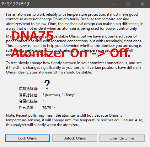 Hello. My DNA 75C is "short" when remove the atomizer. After resetting, it becomes "CHECK ATOMIZER" before attaching the atomizer. I examined it with ATOMIZER ANALYZER, after removing the atomizer, the value of 100 ohms or more appears. My MOD is actually not short-circuited. Is there a problem with my board? . Revision:20 Theme:Default Theme. ( "Factory Setting Reset." )