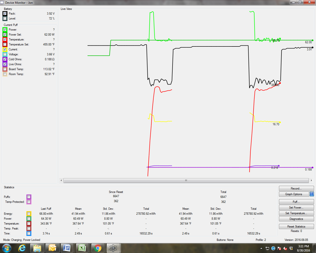 Good Afternoon, The Therion is my first DNA device, but I am having trouble getting temperature control (specifically SS316L) to work properly. I'm not an expert in terms of Escribe, but I've explored it quite a lot trying to get temperature control to work. It is very frustrating to say the least. I have seen quite a few threads regarding the same issue, but nothing I've tried in those threads has worked. Let me try to explain what is going on. I am using a Griffin 25, UD 24 gauge SS316L, dual spaced coils reading at .18 ohms. I uploaded the SS316L csv file from steam-engine onto my device and set up a profile for it. In that profile I have temperature dominant selected, set at 455 degrees Fahrenheit, 62W, preheat power at 75W, preheat punch at 5 with a time limit of 1s. Every once in a while, it works perfect, but it seems that when my device goes idle and then I go to fire it again it freaks out and produces barely and vapor and the power reduces drastically. Other times (as shown in the images), it never reaches the correct temperature. Nowhere near what I have it set for. Everything is updated to the latest version. Is there something I'm missing here? I've tried contact coils, spaced, locking ohms, unlocking ohms, checked the atomizer analyzer (it fluctuates between .187 - .189), nothing has kept temp control constant and performing like it should. I love this device, but I would not have purchased it had I known I was basically only going to be able to use it in power mode for SS316L. Thanks y'all!