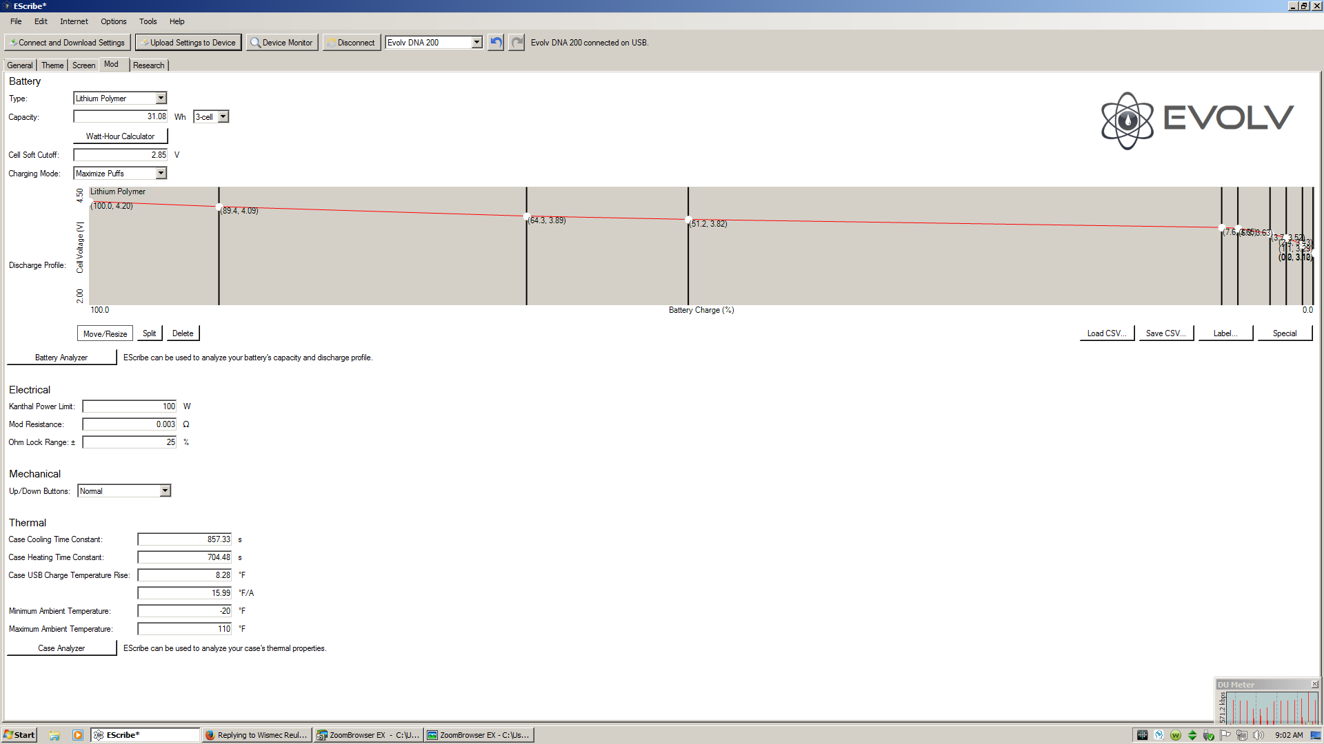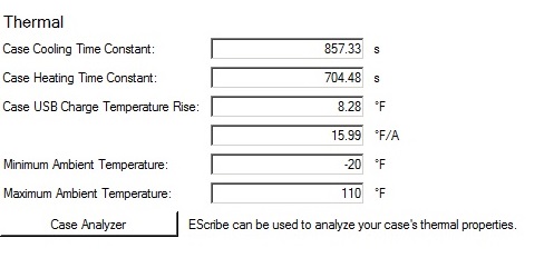 My Results. I ran this test twice a few days apart from about 25% battery remaining, The first time I ran it I left the Reuleaux setting flat, up right on the desk (bottom air holes blocked) and the second time I ran it I propped the mod front up on my mouse pad so airflow could enter the bottom air holes. I didn't do a screen capture of the first run however charge temperature rise and Degrees F/A were significantly higher. Attached below is a screen print of my second run. I've always believed "Cooler is Better" when it involves electrical components so I now charge with the mod vertical and the bottom airflow holes exposed. I'm betting the differences we are seeing between each other is caused by a combination of different initial ambient room temperature, battery temperature and the board temperature. Mine was still hot from vaping few minutes previously. Also how well the dna board transfers heat to the metal of the case to dissipate. My actual room temperature for both runs was a little under 70F. I wonder if a little thermal compound between the board mount pads and the case or enlarged airflow holes would help? I might try that someday <grin> I'm also interested in what my results would be in I set the mod inverted (upside down) with the atty removed so air could enter the side air holes and exit out the bottom air holes facing up? Plan on trying that soon myself. What I think I want to see is a low Case USB Temperature Rise and a low F/A value. Does anyone know what the heating and cooling constants represent?