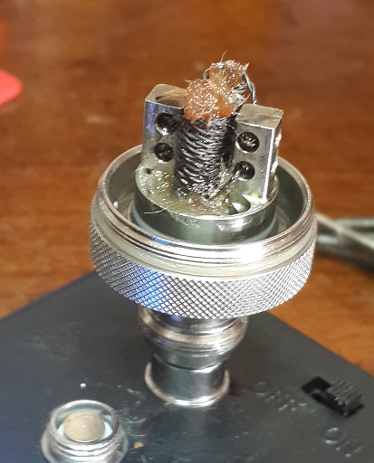 I almost hate to show a picture. It is a Very Ugly Coil but has lots of mass and surface area and vapes well. There isn't a lot of room under the bottom end of the coil. Maybe 3/16". Actually Looks more difficult than it is to wick a set of verticals. With a little practice, less than a minute to wick. Wicking requires long strand cotton. I use Japanese cotton. Regular organic cotton from a cotton ball doesn't work very well. Feed cotton into the top until it sticks out from the bottom a bit. Capture the tip of the wick with a needle point and fish it out to the side until you can grab it with finger tips or tweezers. With needle point press down on the cotton into the well while pulling out the tail. A two hand operation. Loosely fill the juice well with cotton and trim the top almost flush just a little above the top of the coil