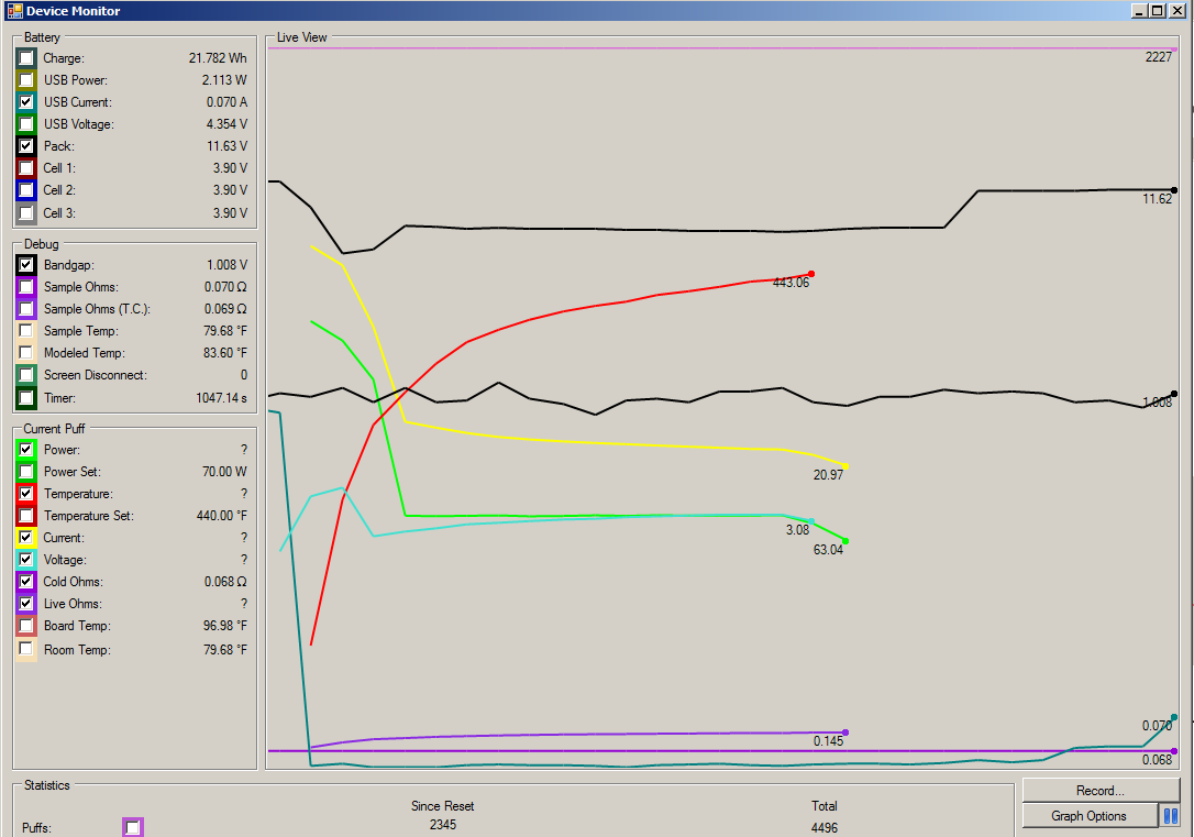 My Results. I ran this test twice a few days apart from about 25% battery remaining, The first time I ran it I left the Reuleaux setting flat, up right on the desk (bottom air holes blocked) and the second time I ran it I propped the mod front up on my mouse pad so airflow could enter the bottom air holes. I didn't do a screen capture of the first run however charge temperature rise and Degrees F/A were significantly higher. Attached below is a screen print of my second run. I've always believed "Cooler is Better" when it involves electrical components so I now charge with the mod vertical and the bottom airflow holes exposed. I'm betting the differences we are seeing between each other is caused by a combination of different initial ambient room temperature, battery temperature and the board temperature. Mine was still hot from vaping few minutes previously. Also how well the dna board transfers heat to the metal of the case to dissipate. My actual room temperature for both runs was a little under 70F. I wonder if a little thermal compound between the board mount pads and the case or enlarged airflow holes would help? I might try that someday <grin> I'm also interested in what my results would be in I set the mod inverted (upside down) with the atty removed so air could enter the side air holes and exit out the bottom air holes facing up? Plan on trying that soon myself. What I think I want to see is a low Case USB Temperature Rise and a low F/A value. Does anyone know what the heating and cooling constants represent?