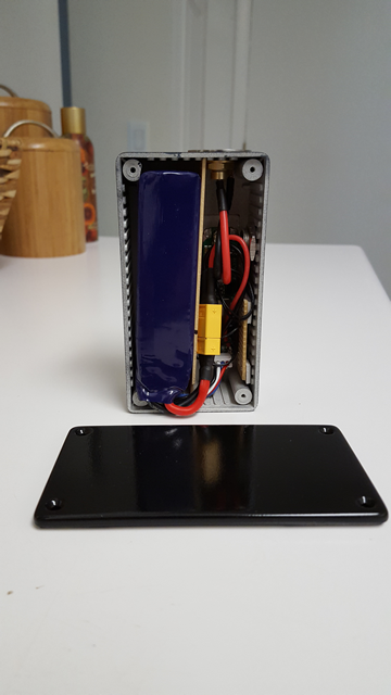 He is my new DNA 200 Hammond 1591 C ABS enclosure Mamu face plate Turnigy nano-tech 2250mah 3S 65~130C Lipo Pack Mitek 16 mm fire button C&K tactile switches It took about 6 hours total to build including gluing the face plate, sanding and painting the box. Battery last about 13 hours of heavy vaping. My next project will be a Turnigy A-Spec 4200 hard pack.