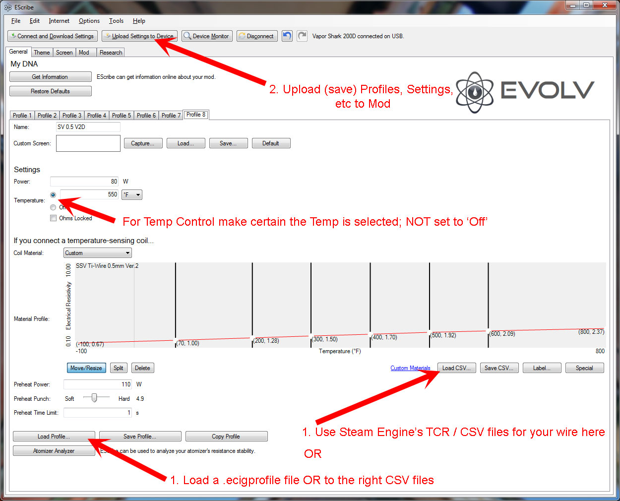 You're limited to 8 Profiles and rather than a CSV I would use the Save / Load Profile... (.ecigprofile) option which saves ALL of the settings for each individual Profile. You need the latest firmware 2015-10-21 EScribe 1.0.35.2 - /topic/66731-topic/ Note the Profile 1 ... Profile 8 tabs in Escribe, they're all available once uploaded to your Mod. To change from Profile 1-8 you hold the +/- to lock (Power Lock) then press ++ or -- then + or - to change profiles. -