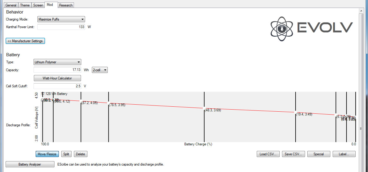 The Theoretical vs Reality -- If you're running a flashlight with nearly no load maybe, or you don't care about the battery charging properly nor the discharge indicator then use those settings. Additionally, the standard battery profile discharge isn't for a Sony VTC5. The Evolv DNA 200 Battery Profile, Wh and Cutoff in practice represent the battery with a Load on the battery that represents typical usage. I'm posting actual settings and a battery profile for a new matched set in 2S configuration with 10A draw (40W). IF the load exceeds >10A or higher you can potentially generate 'Weak Battery' and other battery related errors. Using the default battery configuration is a guarantee to problems. The reason no or very few batteries on the DNA 200 have 'rated' Wh is simple, 10A isn't 0.5A and both the battery's efficiency and heat (waste) through internal resistance and a higher cutoff to ensure stability. Sony, LG, Samsung, .. all that offer a performance data sheet will show a lower Wh rating at high (10A) draw verses the rated (0.5A) draw. Lastly, if you typically vape at 15A-20A load on the battery then I'd strongly recommend you run your own Battery Analyzer, it's easy and takes couple hours or so depending on the Load. Battery Profile (2S Sony VTC5) - http://www.filedropper.com/2ssonyvtc5batteryprofile Actual settings: Capacity 17.13 Cutoff 2.5V -