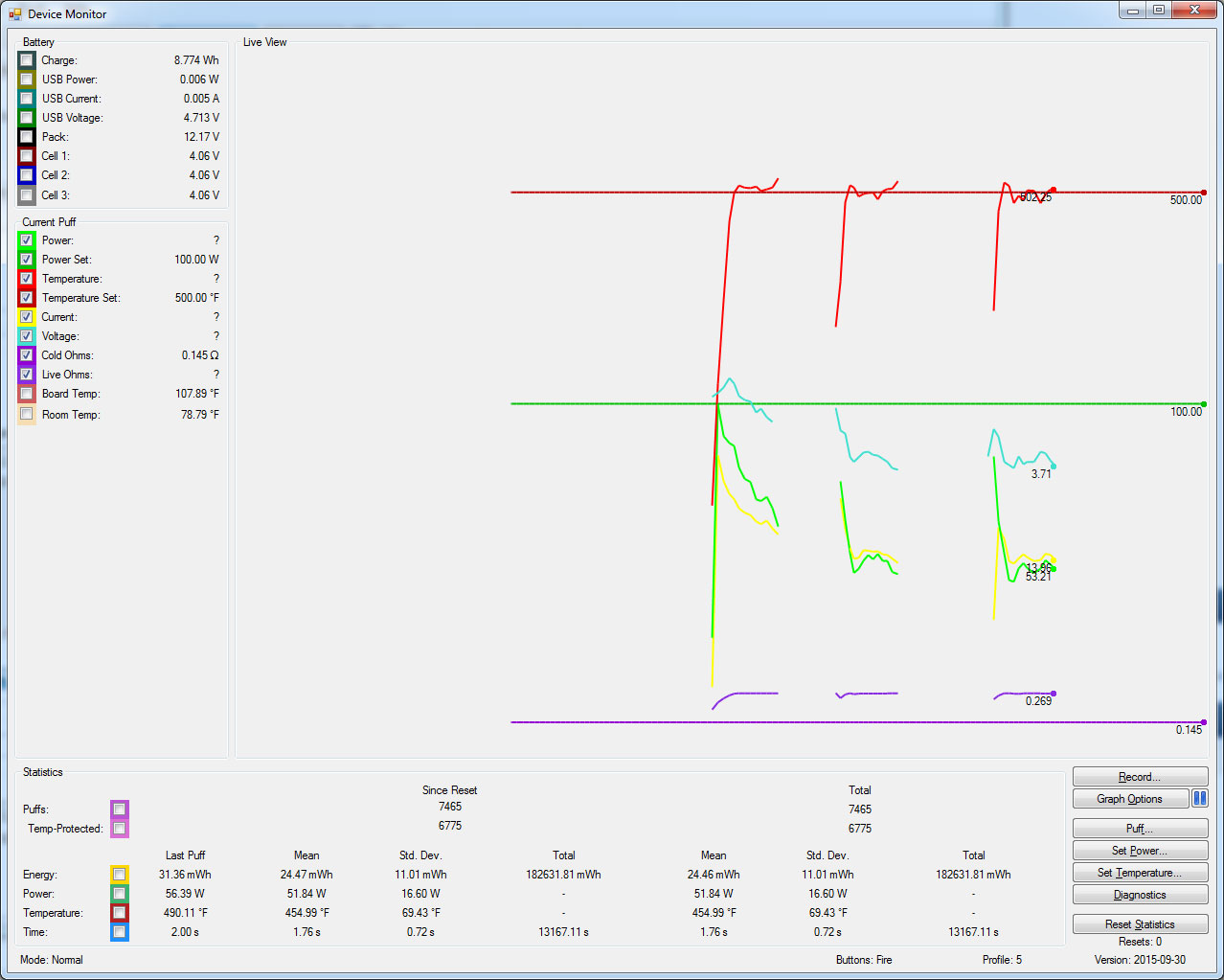 Looking at your graph it appears like the Power (Watts) is set too low, for testing I set mine up to 100W the coils require ~60W (see the Power settle around ~53W). You're not even reaching the Set Temperature of 420F. Now IF it's way too hot and the Profile is properly uploaded then that leaves the Ohm's not correctly Locking. For a trial either select the [X] Ohms Locked once the Atty settles to room temperature ~5-6 minutes or preferred -- upload the settings again and choose the '+' New Coil. If an Atty gets locked at a resistance higher then the Mod actually thinks it's cooler than it actually is and the temps can get very hot. Additionally, I'm posting (2) CSV files that have a cooler profile than Sweet Spot and you might want to try them - http://www.filedropper.com/sweetspottcvfilesjaquith Let me know!