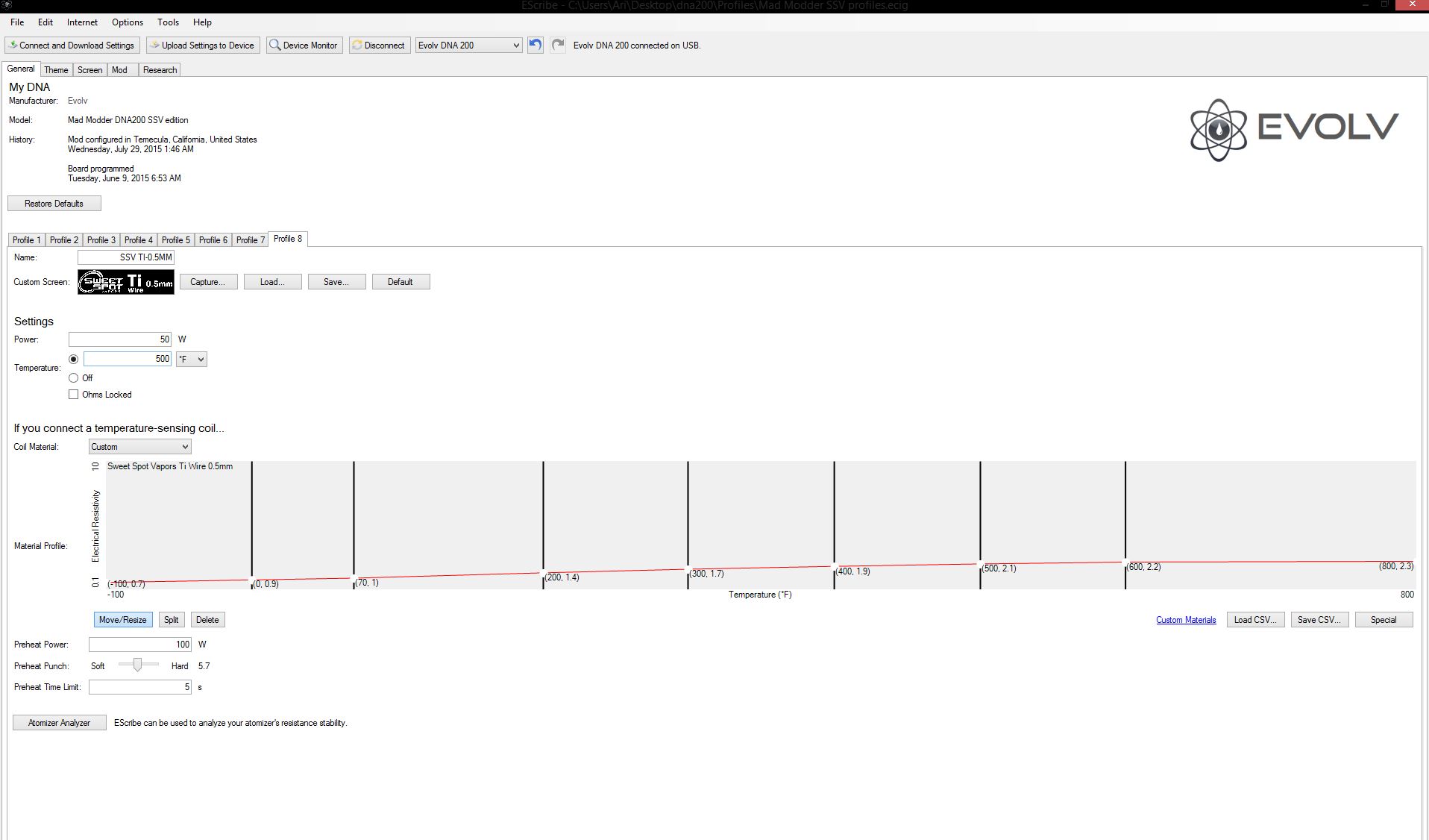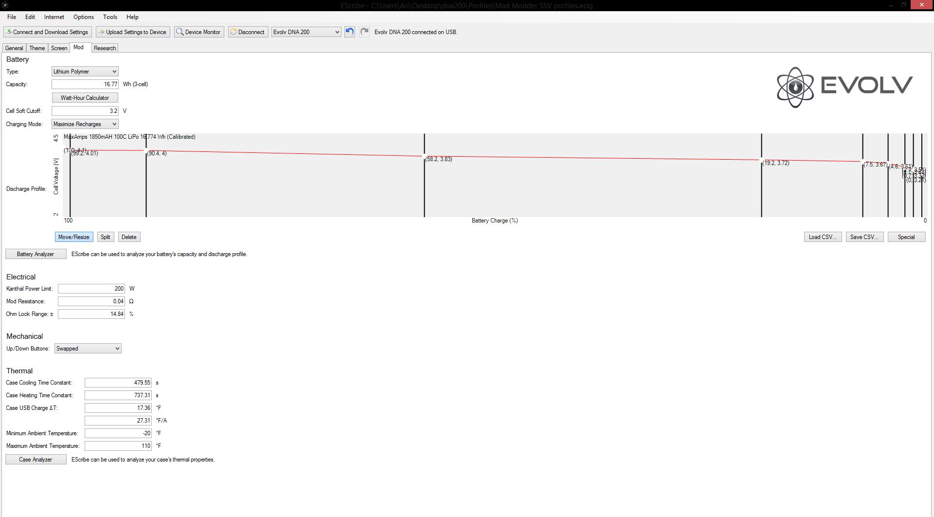 The csv is only the tip of the iceberg in our calibration.....the csv is in "beta" with the rest of the cals....what we are doing is not only providing TFR curves for each wire, but also mod resistance nulls, case thermal calibrations, battery calibrations etc.....they are all packed into the production utility which will all go live on our site (custom screens and all) as soon as beta is confirmed....it's not as simple as just passing out a CSV file, it's ensuring that the mod resistance etc is nulled, and packaging everything into production utility, and being able to offer some form of support/warranty that the fundamental changes aren't going to void a warranty form manufacturer etc....if anyone wants the beta package I'm happy to provide it, but it's a use at your own risk situation for another week or two.... you can feel free to PM me or if evolv wants to open up a section for us to drop the files into a database, for download, I am fine with that.... keep in mind this is being done as a "free of charge courtesy" for our customers, so I don't think it's quite fair to be too demanding about the project (we are def doing our best for our customers though).....as we have spent a very large sum of resources (equipment, time money etc) into providing this as a "free" service.....and frankly I don't see anyone else doing it (this way, specific to their wire)....our goal is to support not only the wire, but our wire WITH ALL dna200 3rd party mods....simple TFR curves don't completely calibrate the device.....I would ultimately like to see a section on our webpage, that has a discreet installer package, to "convert" each 3rd party mod to an "SSV edition"....that has a sample device as a known point of reference (for accuracy)....I.E. Ronnies, Mad Modder DNA200 will be the first complete "installer/package". It basically assures the device is accurate in a specific application (with each of our wire products). So as we acquire 3rd party sample/reference boxes, we can add to that list of supported devices....I understand that a lot of people who are here are more tech savvy, and all they need is csv data.....but we have been giving out beta files for a week or so now, and are quickly discovering your average vaper is going to have a lot of trouble with eScribe (when all they want to do is "make it work and vape"). With the production installer utility, and our package (.ECIGp file) we can assure that if an end user gets in "trouble" they can always go back to defaults, and those defaults will be our own in house "guaranteed calibrations/datasets"... Please be patient, as not only is this an engineering effort, but also an effort to work directly with manufacturers, to fully support each specific dna200 mod that comes out.... here are the beta packages for mad modder dna200 box....
