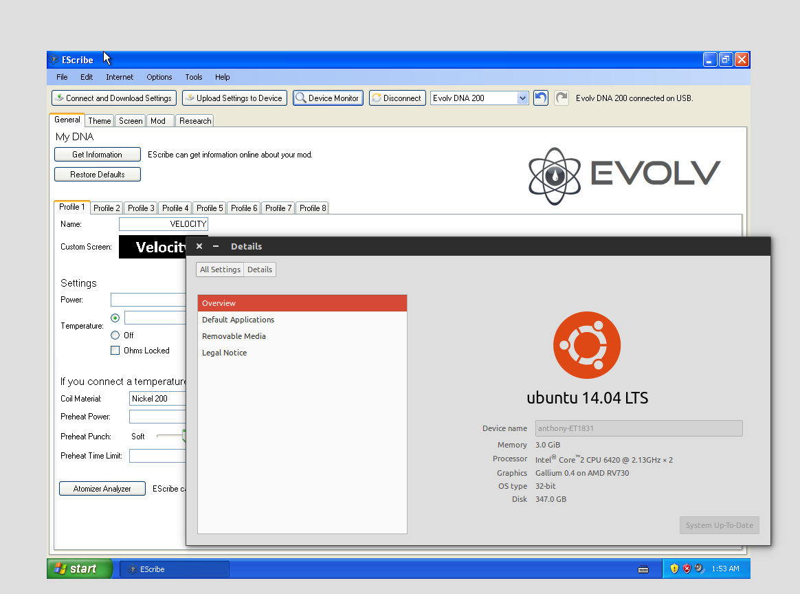 Thanks. Yeah, this is an OS, issue not an escribe issue per se. Need Ubuntu to see the DNA. . . and it is, it's just not talking to it. I think I need to find out what device library contains the API for the DNA200, if it's even in Linux-land. I may need to bother people over there. Edit, updated USB library. Still not talking. anthony@anthony-ET1831:~$ lsusb Bus 001 Device 004: ID 1307:0330 Transcend Information, Inc. 63-in-1 Multi-Card Reader/Writer Bus 001 Device 001: ID 1d6b:0002 Linux Foundation 2.0 root hub Bus 002 Device 004: ID 045e:0745 Microsoft Corp. Nano Transceiver v1.0 for Bluetooth Bus 002 Device 003: ID 04b8:084d Seiko Epson Corp. PX-402A [Stylus SX115/Stylus NX110 Series] Bus 002 Device 008: ID 268b:0405 Bus 002 Device 007: ID 0461:4d75 Primax Electronics, Ltd Rocketfish RF-FLBTAD Bluetooth Adapter Bus 002 Device 006: ID 0a5c:4503 Broadcom Corp. Mouse (Boot Interface Subclass) Bus 002 Device 005: ID 0a5c:4502 Broadcom Corp. Keyboard (Boot Interface Subclass) Bus 002 Device 002: ID 0a5c:4500 Broadcom Corp. BCM2046B1 USB 2.0 Hub (part of BCM2046 Bluetooth) Bus 002 Device 001: ID 1d6b:0001 Linux Foundation 1.1 root hub anthony@anthony-ET1831:~$ No time before work to fiddle in terminal. I'll deal with it when I get home from work.