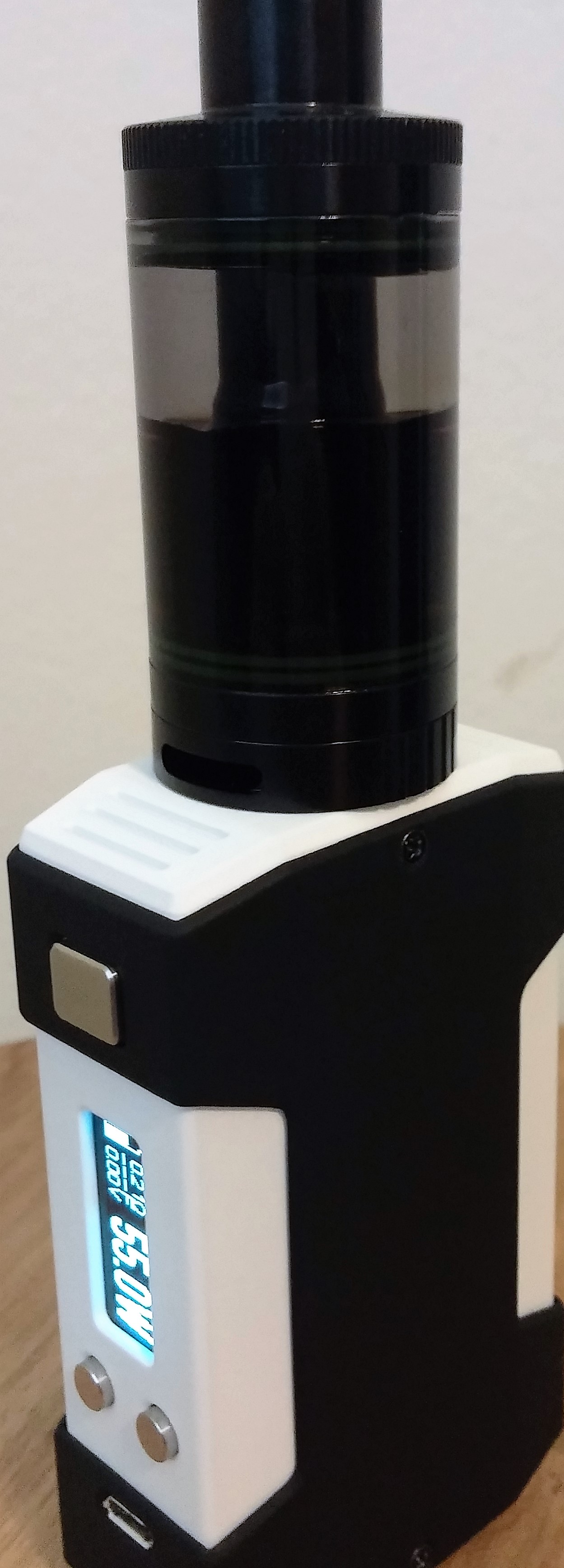 4. I really like this mod, the buttons feel really good and the size is just right. Throw in a centered pin and a big battery it becomes mighty fine indeed. It's shorter than all my 18650 mods cept for the cuboid which it is equal. Super lightweight most tanks I use on it are heavier than the box. Here is a pic with my giant VCMT 30mm and it's a bit overkill but I can pull it off. That tiny beveled edge ruins the perfect flush fit but you can't even see it in the picture so I'm just OCD about stuff I guess.