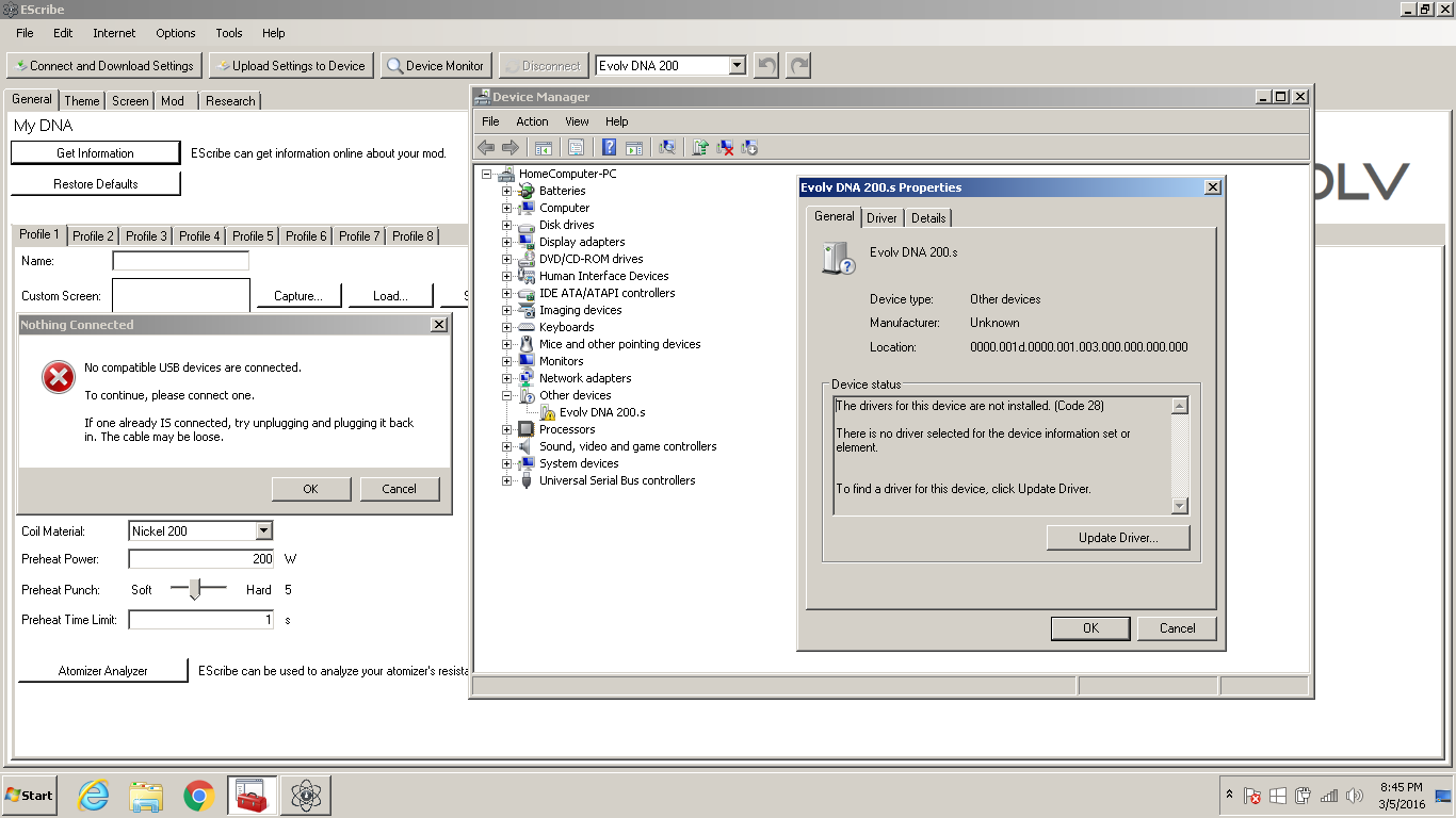 There is a post of a VaporShark DNA 200 not properly installing on a Windows 8 OS aswell. I just want to be sure that we are aware some more devices may not be installing on other various Operating Systems. So far I have tried installing my device on the following: Windows 7 Windows 8 Windows 10 Every computer I have tried is up to date. What a bummer, I felt it in my guts that I would be arriving home to Problems lol ouch...