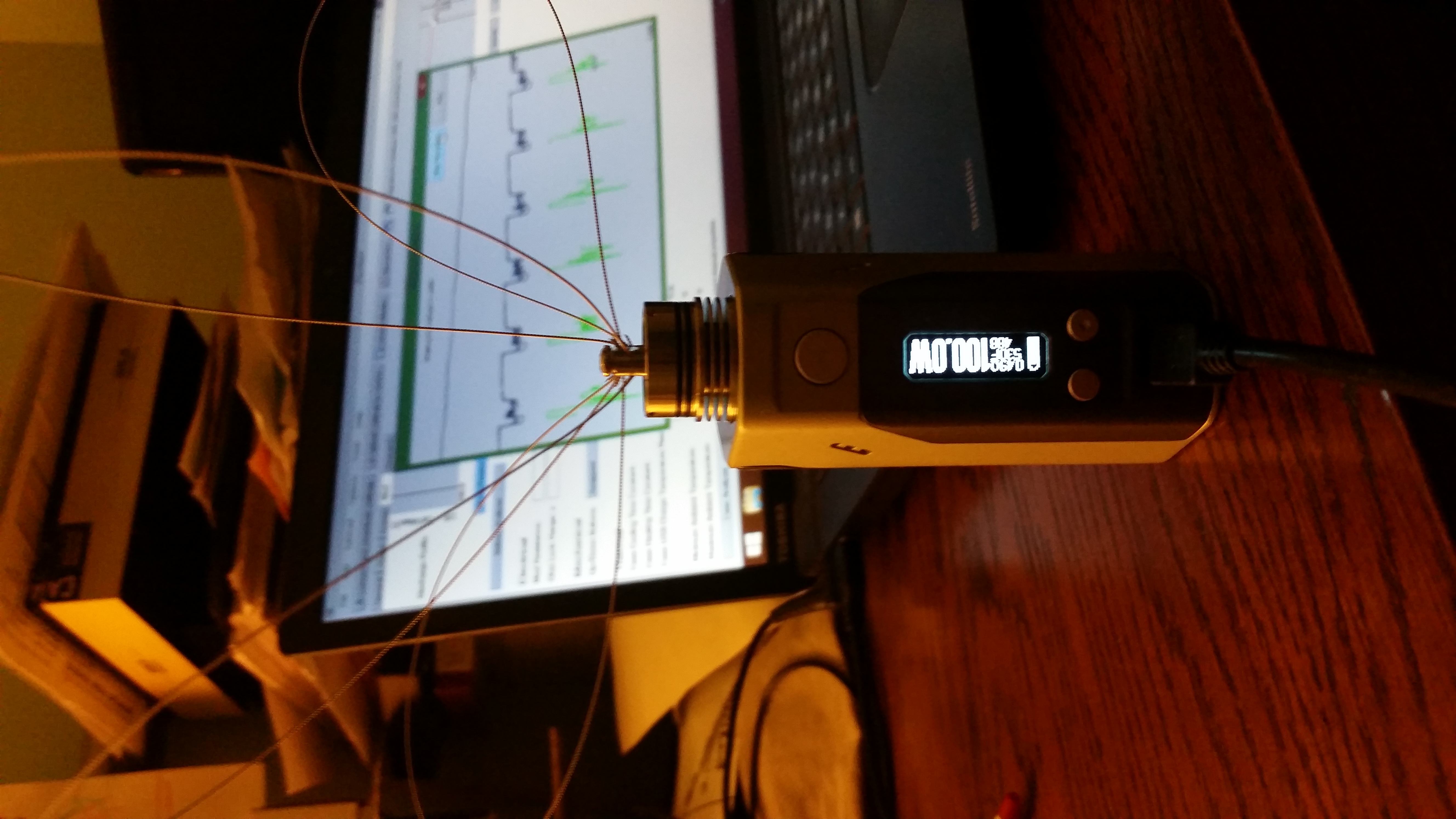 Hey so in escribe (while the mod is charging via usb inside escribe) i notice when my reu is sitting on the table as it should the temp was ever increasing to 98*F when i couldnt take it anymore and flipped it upside down and immediately the temperature began to drop (finally resting at about 73*F). I recommend charging the batteries in this device with no atoizers connected and sitting upside down with the 510 connection flat on the table, exposing all air holes better. 1.)Did you notice when connected to escribe when you reach a ful 4.2v charge instead of remaining charged the batteries begin to discharge? 2.)Also when i input usb amp i set it to 1.0A why does it only charge at ~0.5A on escribe, does it do this at the wall also? (with a 1.oA wall charger does it only receive ~0.5A?) When the mod is connected to a 1A charger at the wall (not on escribe but through usb wall charger) it will charge to 4.2v and remain 4.2v
