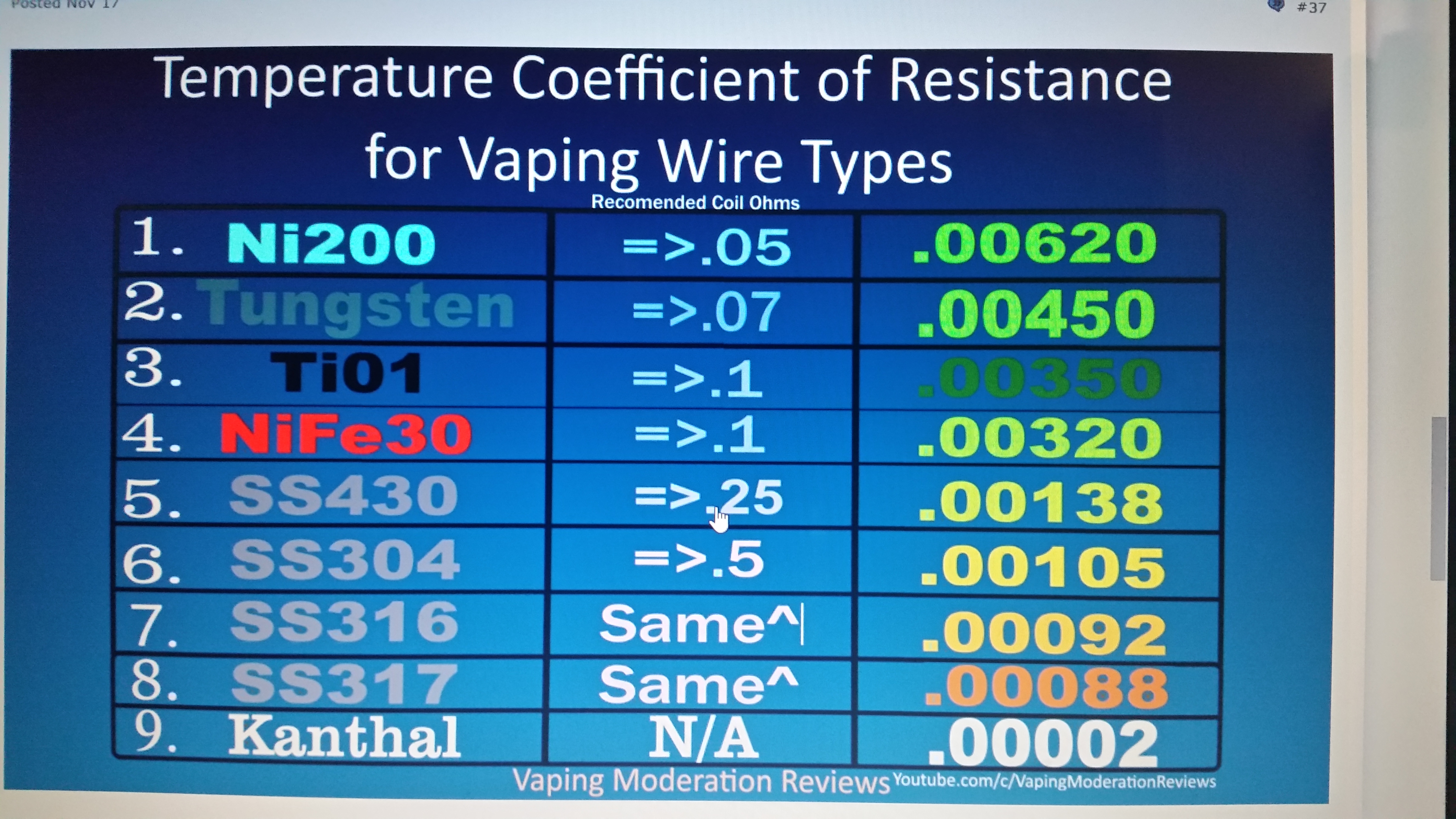 The suggested ohms in that chart refers to how you should build your coils as to what resistance you built it to. Using the TCR number as opposed to using the CSV is what I have been suggesting to jewisbullie04. That is just based on my experience with my build. It helped me. Basicly with SS316L for me. I set the TCR as low as the software would let me go and that seemed to tame the ramping or rollercoaster of the temp. So based on the chart above for TI grade 1 wire it suggested a 0.10 ohm build for temp control to work well. YMMV. Try it out, what is the worst thing that will happen? burned cotton or bad stuff from TI wire if it's too hot? Be careful. Eventually you will find what works.
