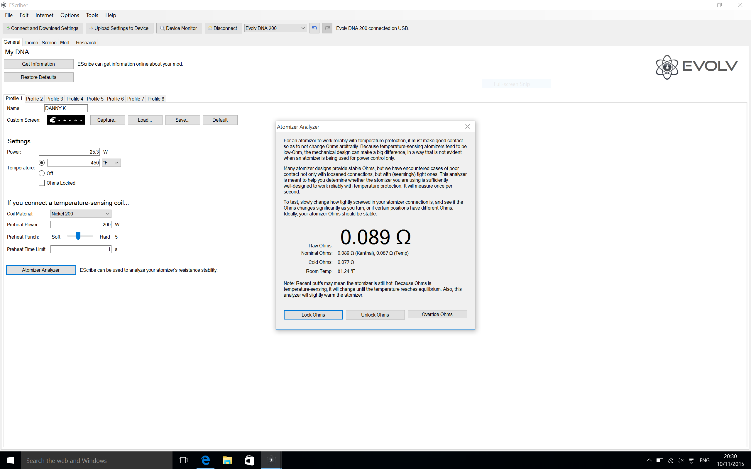 Apologies if this has been asked before Could someone take a look a few screenshots / csv files to see if this is normal This is a Ni200 build yet the atomizer analyser says (kanthal) ? is this correct ? Also Preheat is set to 200 (Default) ? Any advice would be greatly appreciated. DNA2.xls DNA.xls