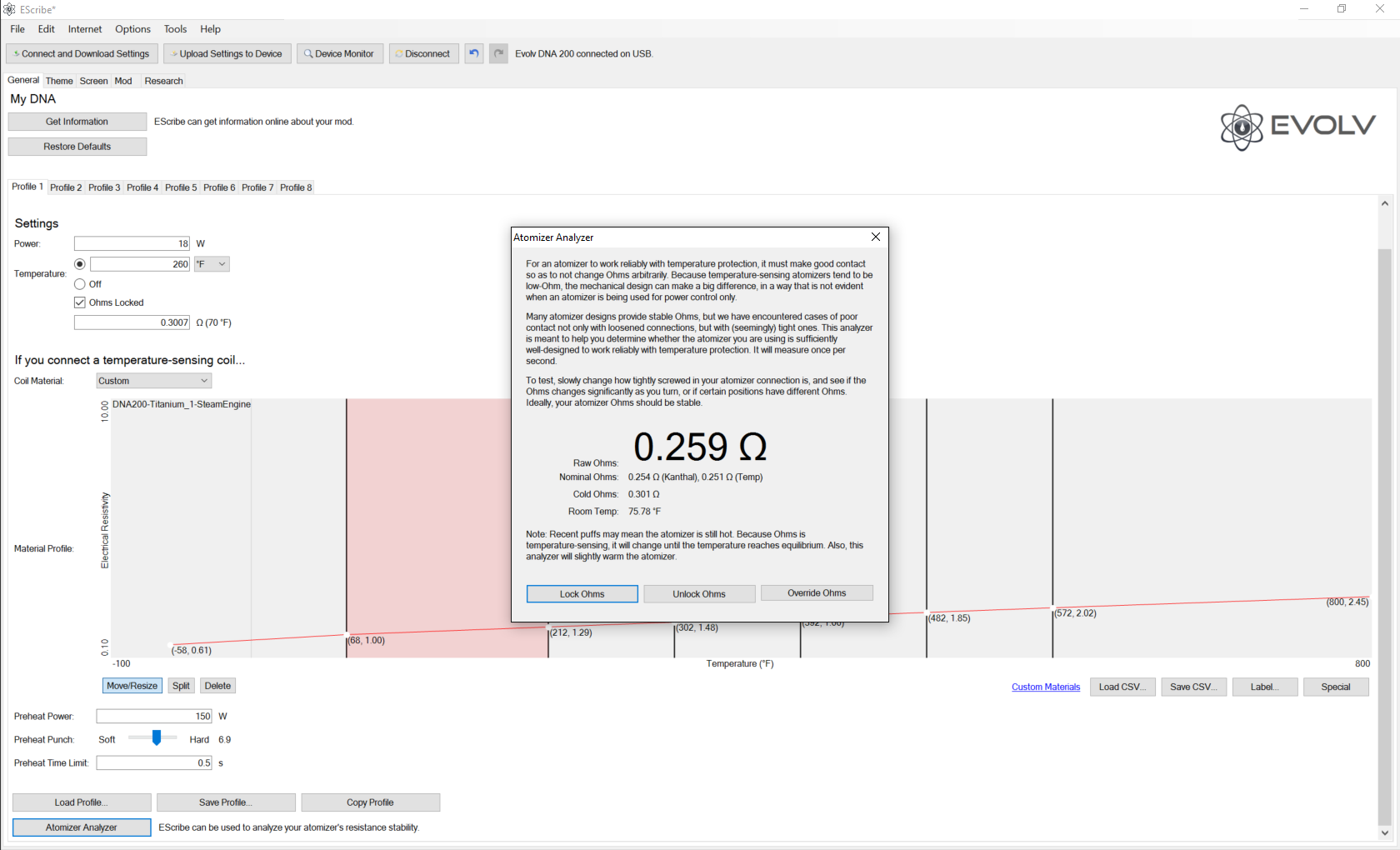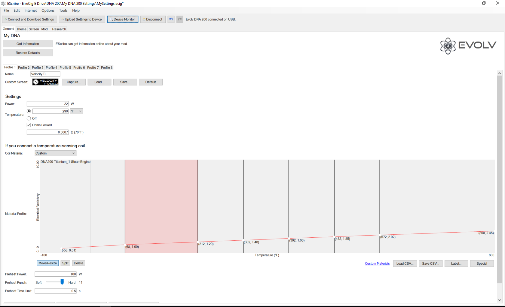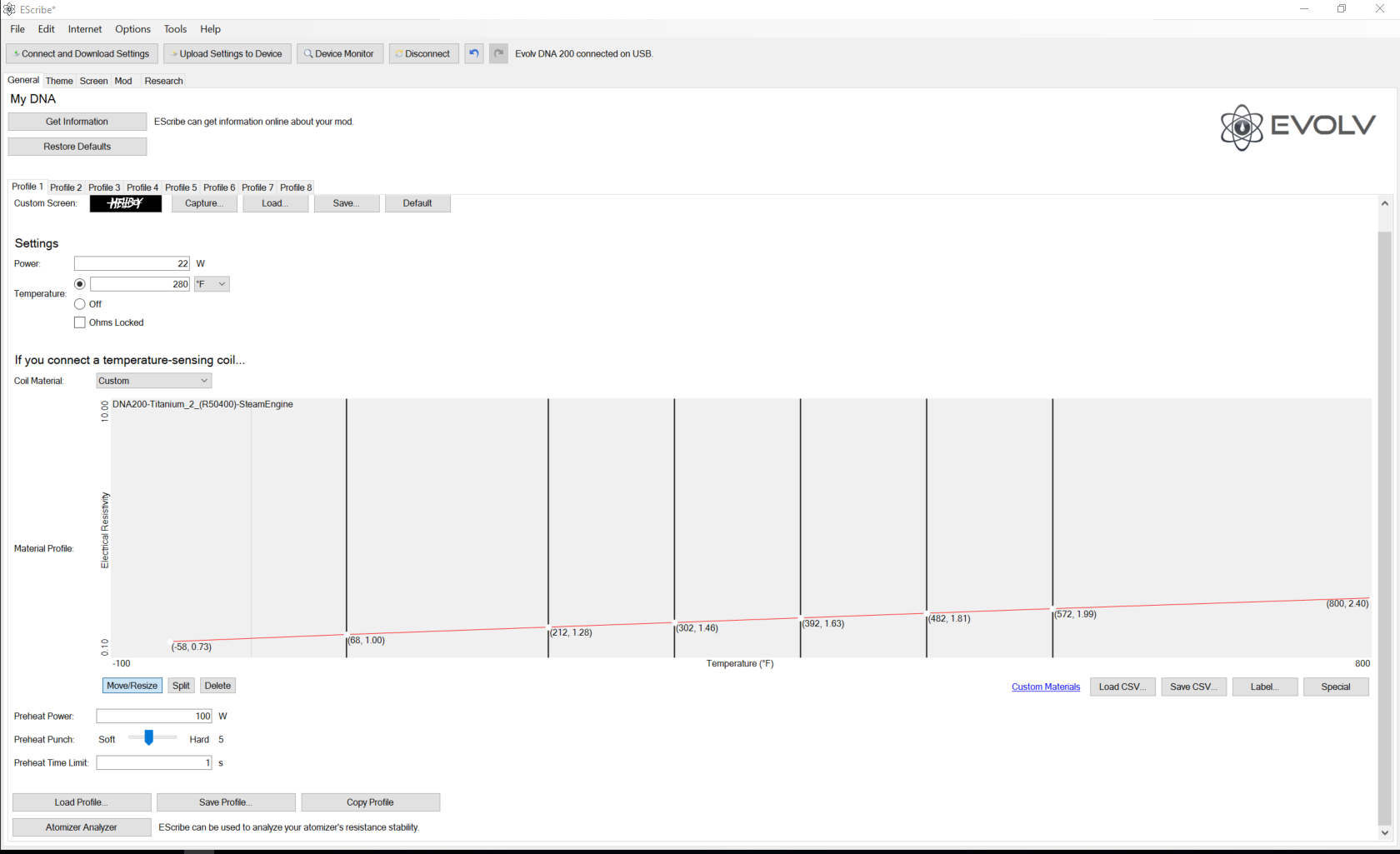 Note: After posting this and letting the DNA 200 sit for a few minutes, it is doing it again. Low Watt Temp Protect. nothing changed from my last vape when it was working. Other than the case cooled.Tried doing a soft reboot, and nothing, same issue, Switch to a Nickle Profile, no issues. This is without a doubt a custom TFR issue. 1.035.2 (FW: 2015-09-30.sw-update) Thank you for replying. But I'm not buying it. The Mod works all day long on Ni200 for Coil Material But as soon as I load a Custom TFR/TCR it goes all wonky on that profile I can run my atty's in Ni200 profile, at 100W +/- less, like most mods that don't support Ti, it works all day long. This has ZERO to do with not detecting Temp Mode. Cause it hits Temp Protect. Not gonna hit Temp Protect if it is not detecting Temp Control. I have tried Steam Engine Ti Grade 1 and Grade 2 And I did it again. and it took a Soft Reset of the device to get the Profile to start working And it is working as it should. Profile 1, Load CSV Upload Settings to Device Hit the fire button Settings go all Wonky https://www.youtube.com/watch?v=9Im2LUY3MPY Soft Reset the device and everything works. Sometimes it takes a few re-uploads and resets to get it to work. This is why I am thinking that the DNA 200 is not loading/reading Custom TFR files properly. While I was actually using it, it went into Low Watt Temp Protect. This is what I am calling it. It sticks around 10 Watts and hits Temp Protect and produces no vapor at all. This is a bug in Custom TFR. Cause it does not do this when using Nickle Profile. Evolv needs to build a default Ti Coil Material Profile and fix Custom TFR. However, I am willing to figure out what it takes to make it work properly, efficiently and stable with Ti. I just don't think we can do this. It's in the Firmware/Software. more than likely the Firmware. One thing that this still needs is for it to cut off power completely when it actually hits Temp Protect. it doesn't do this. it needs to treat it like a Dry Coil. Hit Temp Protect and it stops firing till you release the fire button. I uderstand what Temp Protect is doing. And you want to bring your Watts down to just under where your Temp maxes out. This is all fine, but it should cut power when it hits Temp Protect, cause this is more about stopping Cotton Singe and possible over heat of the coil. I know it stops for a moment till it cools and if you keep firing it will hold that temp and keep cutting out. but it is slightly inefficient way of doing it. This is what I believe the Yihi Chips do. I am still on the fence about Ti anyway, and won't do Nickle. Bottom line, from everything that I am seeing, the DNA 200 does not handle Custom TFR very well at this time. Side Note:
