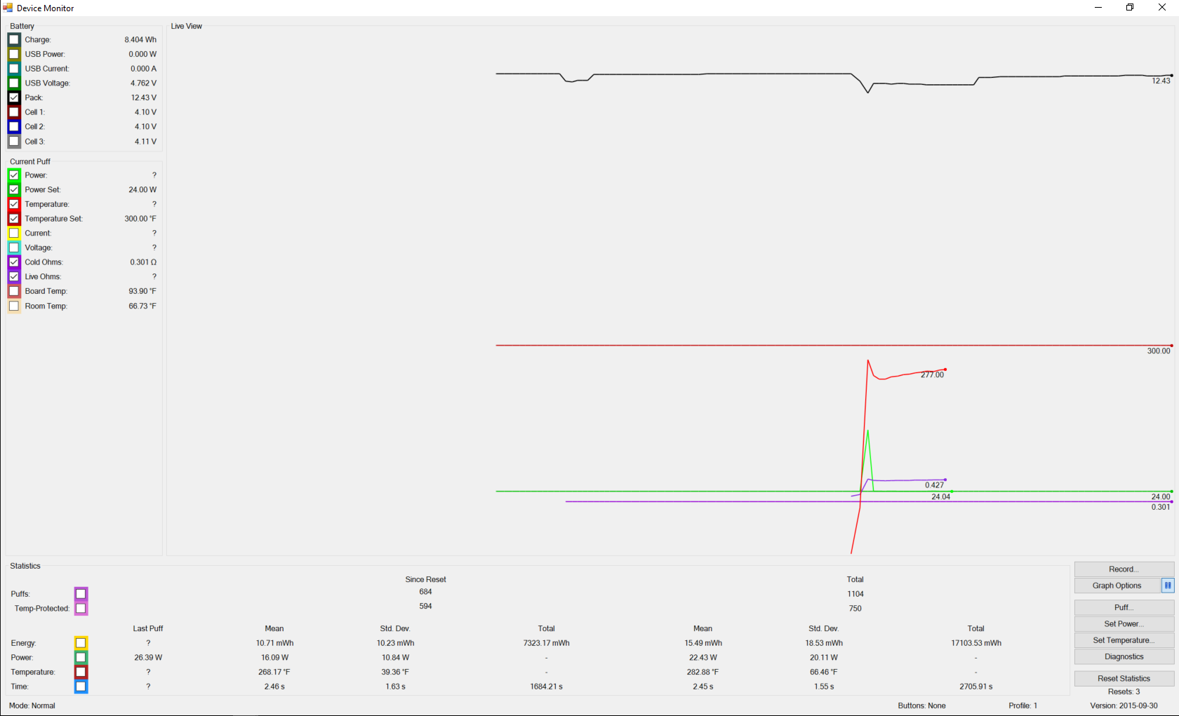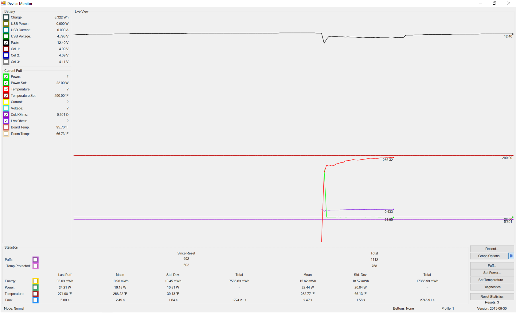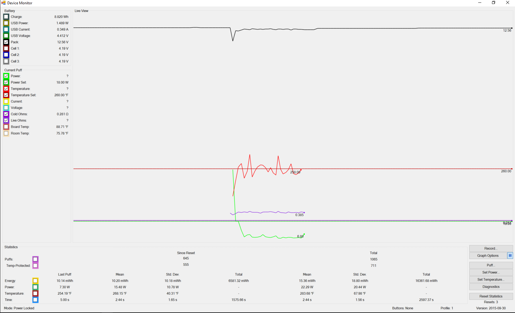 I ran the test at 75*F According to Atomizer Analyzer the Room Temp was 76*F However, this test may be inaccurate. I ran it when it was almost fully charged I will run it again when it is about half charge. The test took about 2.5 to 3 hours. Also note, I Loaded the CSV Battery file from here And I also set these Battery Capacity: 9.99Wh Soft Cell Cutoff: 3.09v Mod Internal Resistance: 0.007 Ohms Based on what I am seeing and from others posting their results for other mods. It's hard to say how accurate the Case Analyzer actually is. Room Temp, if this is not constant everywhere you decide to vape and charge, these numbers very well could change This could cause big fluctuations. Right now, my Room temp from Atomizer Analyzer shows 65*F, but, I am in the same room I was in when I ran it the first time. Yes, I believe that Temp is correct though. it is colder in here than when I ran it before. I will run it 2 more times, and I will check both the Atomizer Analyzer and a Thermometer in this room and average the temp from that to run at. Also, the next tests will be run at half charge, and the mod will sit in this room pretty much over night and then run the test. If the results are drastically different, then I could only surmise that Case Analyzer may be kinda useless, as these settings can change based on the actual temp of the mod at any given time Such as, you have it in your pocket, it's gonna heat up a bit, so, where the Analyzer and Thermal settings were set based on a Mod Temp of 70*F, you might be running it at a temp of 85*F How this takes into account settings based on Case Temps and Ambient Temps at any given time, I don't see how this could stay accurate. CASE COOLING TIME CONSTANT: 1623.94 ,,, but this was rounded down to 1000 CASE HEATING TIME CONSTANT: 170.19 CASE USB CHANGE TEMPERATURE RISE: 0.71 F 28.00 F/A