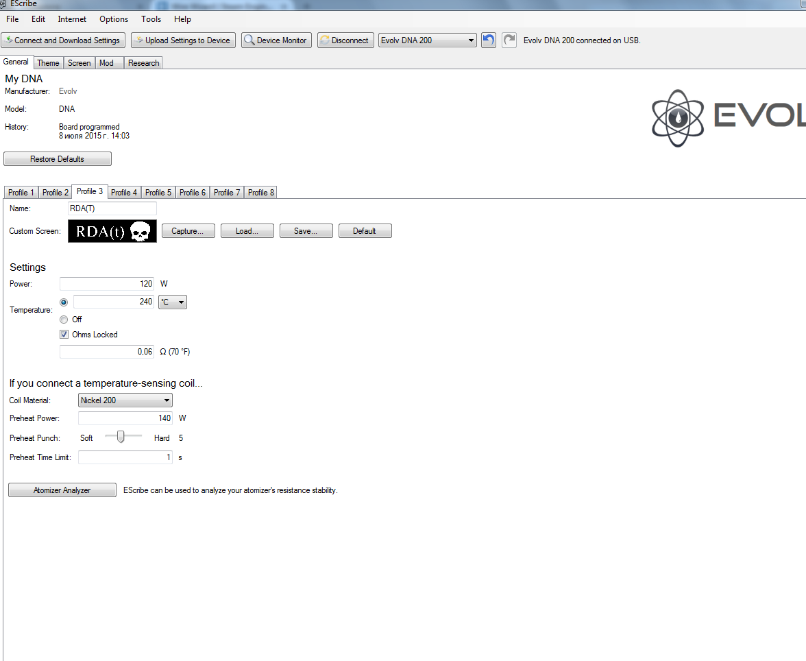 So i build dual coil with Ni200, 0.3mm(28AWG), 8 wraps around 2.3mm drill bit. Down below is my set up from eScribe. I'm getting an insane dry hits at wattage far below then set on eScribe- I've tryed to go down at 40W, still dry hits. If I do 120W coils start to glow red while device is displaying "temperature protected".
