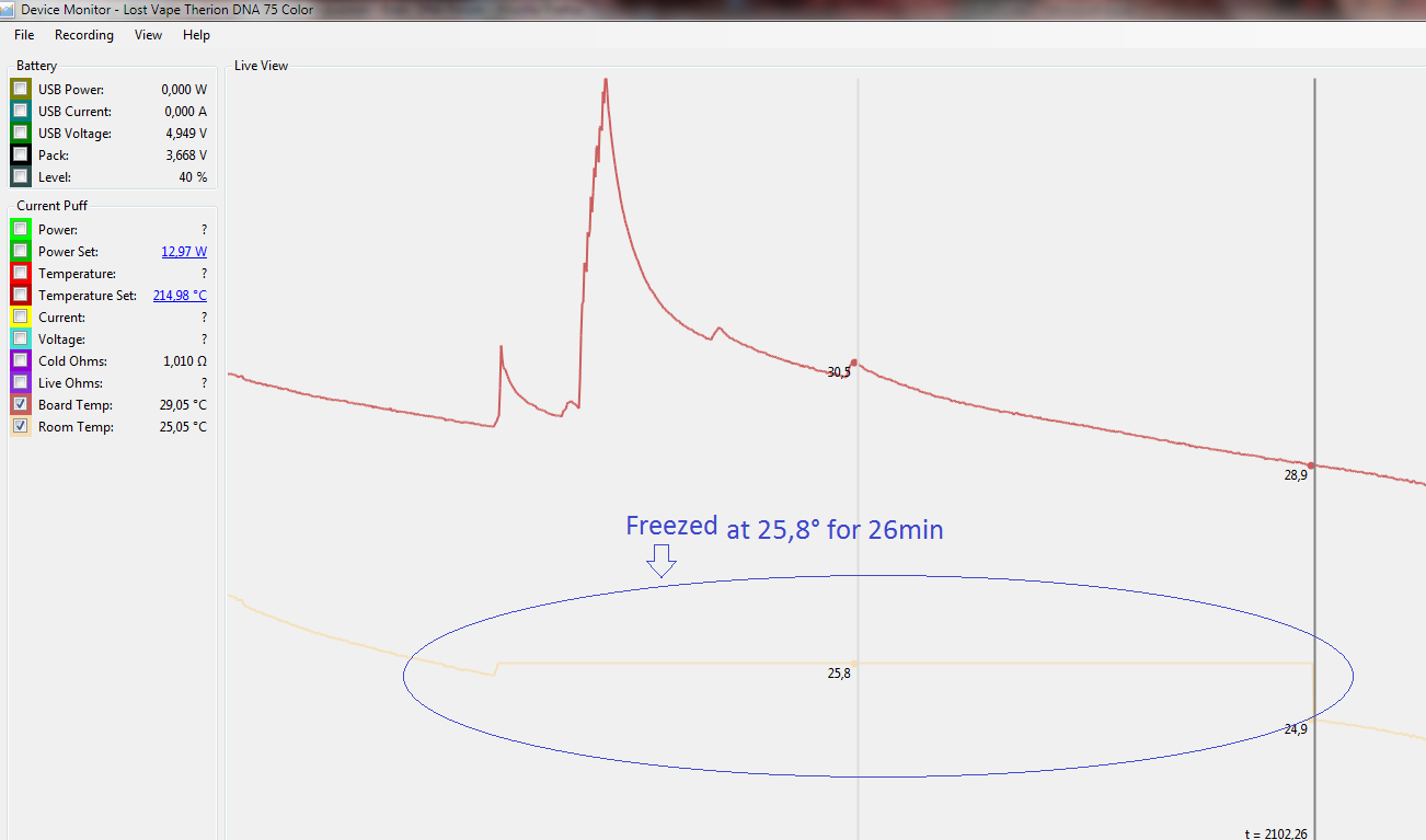 This both on fw24\25 , testing with mod (Therion 75c) connected to device monitor (with USB chargin off). After sometime (I just tested first 26 min , second 16 min , third 39 min freezing) , it unfreezes and restart calculation, with a sudden temp value deviation.
