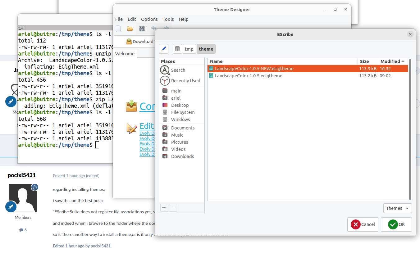 In order to Escribe to recognize a theme (either by opening with "Escribe -> Theme -> Load Theme..." or with the Theme Designer) the xml file (ECigTheme.xml) should be zip compressed and with the .ecigtheme extensión: -