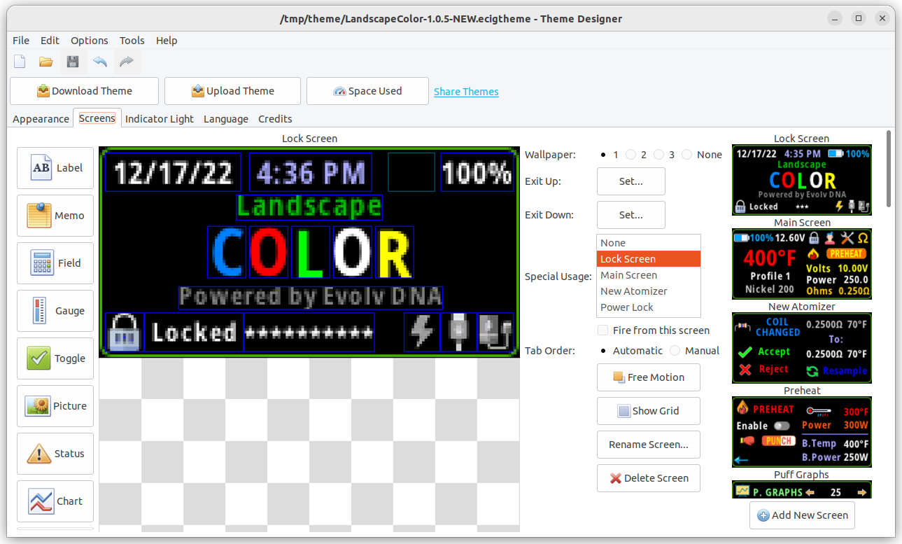 Hi @Mr.Bottomfeeder, I know it is an old thread, did you find a solution for the "Temp Sensing Detect" issue? I understand exactly what you described, I just discovered my theme has the same problem, when a TC Profile is used (a Profile with a Temperature-Sensing material assigned) and Temperature Control is enabled, it checks the "Temp Sensing Detect", so, if for example, the user installs a coil which doesn't support TC, it switches to watts mode and disables some features for that Profile, as Temperature Control, Replay, and shows a message that a coil which doesn't support TC is used in a TC Profile. The problem is (as you described), there is no way to re-check or reset the "Temp Sensing Detect" value / feature, even if you install a proper coil (a TC control capable coil), the "New Atomizer" is detected, or switching between Profiles or Materials assigned to the Profile. The only way is, again, as you described, reloading the config to the board, or removing and reinserting the battery. Weird thing is, I remember that, when I was designing and testing my Theme, I noticed that, by switching between profiles it reset the "Temp Sensing Detect", I guess it was due the firmware version, but I don't remember which one was it, as I updated to the latest version, as it implements the "Highlighted fields now time out after a while". It is like the Function that does the Temp Sensing Detect never runs again. I created a support ticket about this, I hope to get some answer from Evolv. Greetings ! -